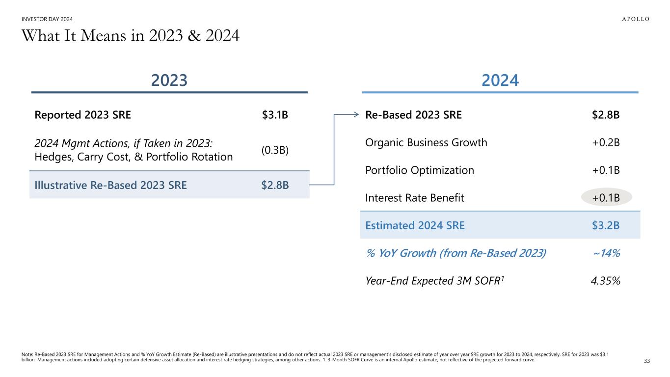 INVESTOR DAY 2024 Management Through Changing Rate Environments 32 3M SOFR 29% 17% 7%3 Athene SRE1 % Net Floating Rate Assets2 1. For periods prior to 2022, SRE represents Athene's historically reported adjusted operating income available to common stockholders excluding the change in fair value of Apollo Operating Group Units, equity-based compensation related to Athene's long-term incentive plan and operating income tax. 2. Calculated as floating rate investments less floating rate liabilities at notional divided by ending net invested assets for the respective period. 3. As of June 30, 2024. $0.7B $1.1B $1.3B $1.4B $1.3B $2.5B $2.5B $3.1B $3.2B 2016 2017 2018 2019 2020 2021 2022 2023 2024E