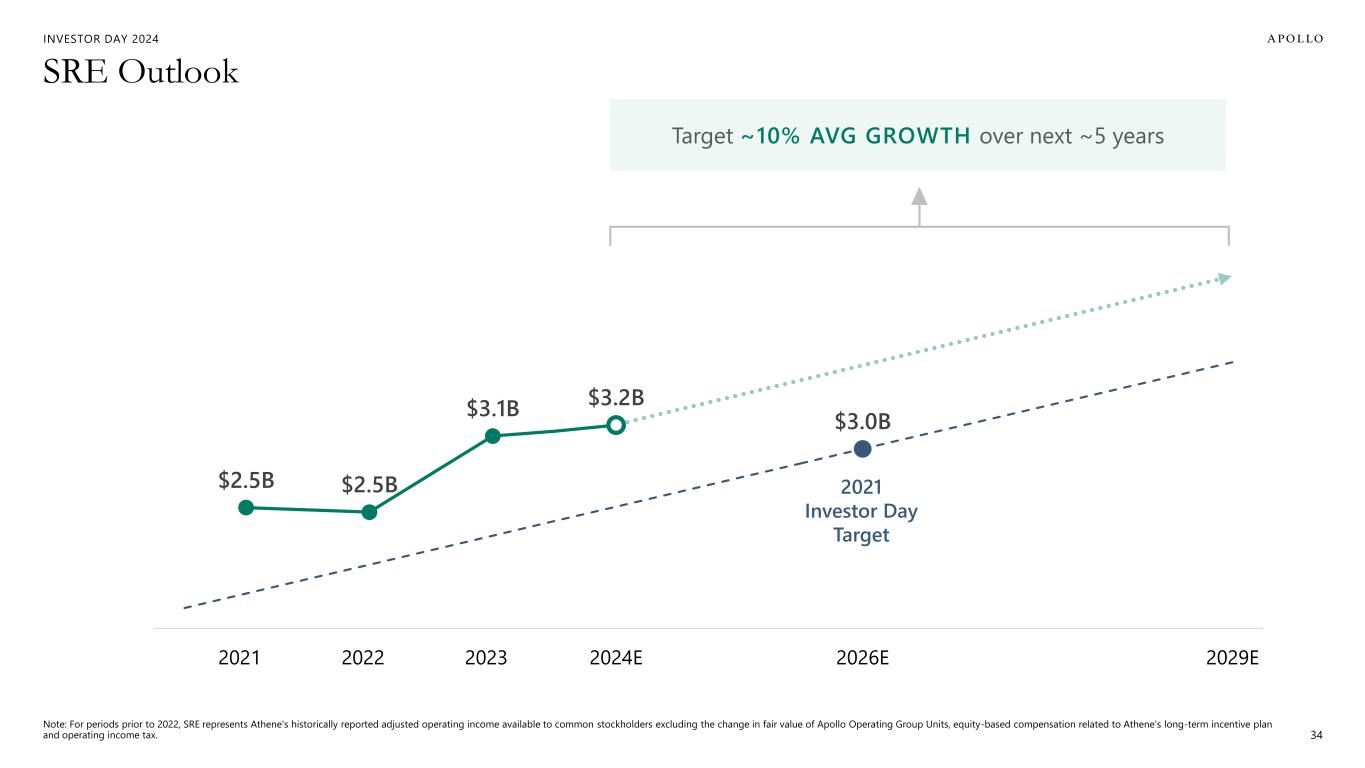 33 What It Means in 2023 & 2024 INVESTOR DAY 2024 2023 Reported 2023 SRE $3.1B 2024 Mgmt Actions, if Taken in 2023: Hedges, Carry Cost, & Portfolio Rotation (0.3B) Illustrative Re-Based 2023 SRE $2.8B 2024 Re-Based 2023 SRE $2.8B Organic Business Growth +0.2B Portfolio Optimization +0.1B Interest Rate Benefit +0.1B Estimated 2024 SRE $3.2B % YoY Growth (from Re-Based 2023) ~14% Year-End Expected 3M SOFR1 4.35% Note: Re-Based 2023 SRE for Management Actions and % YoY Growth Estimate (Re-Based) are illustrative presentations and do not reflect actual 2023 SRE or management's disclosed estimate of year over year SRE growth for 2023 to 2024, respectively. SRE for 2023 was $3.1 billion. Management actions included adopting certain defensive asset allocation and interest rate hedging strategies, among other actions. 1. 3-Month SOFR Curve is an internal Apollo estimate, not reflective of the projected forward curve.