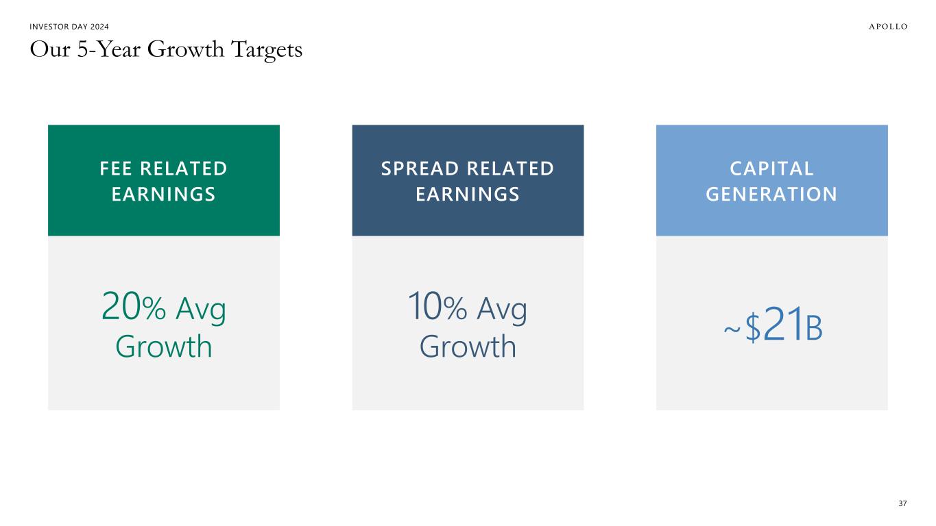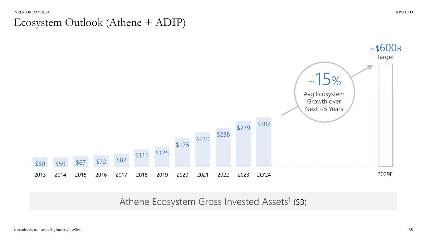 INVESTOR DAY 2024 $2.5B $2.5B $3.1B $3.2B $3.0B 2021A 2022A 2023A 2024E 2025E 2026E 2027E 2028E 2029E SRE Outlook Note: For periods prior to 2022, SRE represents Athene's historically reported adjusted operating income available to common stockholders excluding the change in fair value of Apollo Operating Group Units, equity-based compensation related to Athene's long-term incentive plan and operating income tax. 34 2021 Investor Day Target Target ~10% AVG GROWTH over next ~5 years