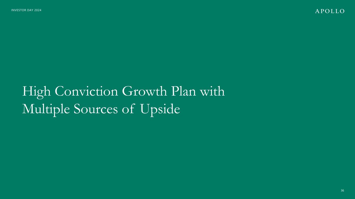 INVESTOR DAY 2024 Ecosystem Outlook (Athene + ADIP) $60 $59 $67 $72 $82 $111 $125 $175 $210 $238 $279 $302 2013 2014 2015 2016 2017 2018 2019 2020 2021 2022 2023 2Q'24 2024E 2025E 2026E 2027E 2028E 2029E ~$600B Target 202 35 Athene Ecosystem Gross Invested Assets1 ($B) ~15% Avg Ecosystem Growth over Next ~5 Years 1. Includes the non-controlling interests in ACRA.
