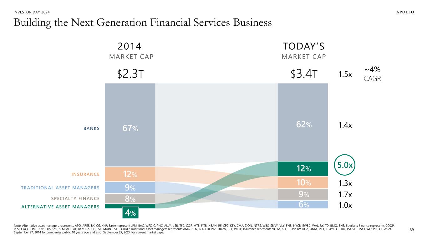 INVESTOR DAY 2024 Building the Next Generation Financial Services Business 39 $2.3T $3.4T 1.4x 1.3x 1.7x 1.0x 67% 12% 9% 8% 4% 62% 12% 10% 9% 6% TODAY’S MARKET CAP 2014 MARKET CAP 5.0x ALTERNATIVE ASSET MANAGERS BANKS INSURANCE TRADITIONAL ASSET MANAGERS SPECIALTY FINANCE ~4% CAGR Note: Alternative asset managers represents APO, ARES, BX, CG, KKR; Banks represent JPM, BAC, WFC, C, PNC, ALLY, USB, TFC, COF, MTB, FITB, HBAN, RF, CFG, KEY, CMA, ZION, NTRS, WBS, SBNY, VLY, FNB, NYCB, EWBC, WAL, RY, TD, BMO, BNS; Specialty Finance represents COOP, PFSI, CACC, OMF, AXP, DFS, SYF, SLM, AER, AL, BXMT, ARCC, FSK, MAIN, PSEC, GBDC; Traditional asset managers represents AMG, BEN, BLK, FHI, IVZ, TROW, STT, WETF; Insurance represents VOYA, AFL, TSX:POW, RGA, UNM, MET, TSX:MFC, PRU, TSX:SLF, TSX:GWO, PRI, GL; As of September 27, 2014 for companies public 10 years ago and as of September 27, 2024 for current market caps. 1.5x
