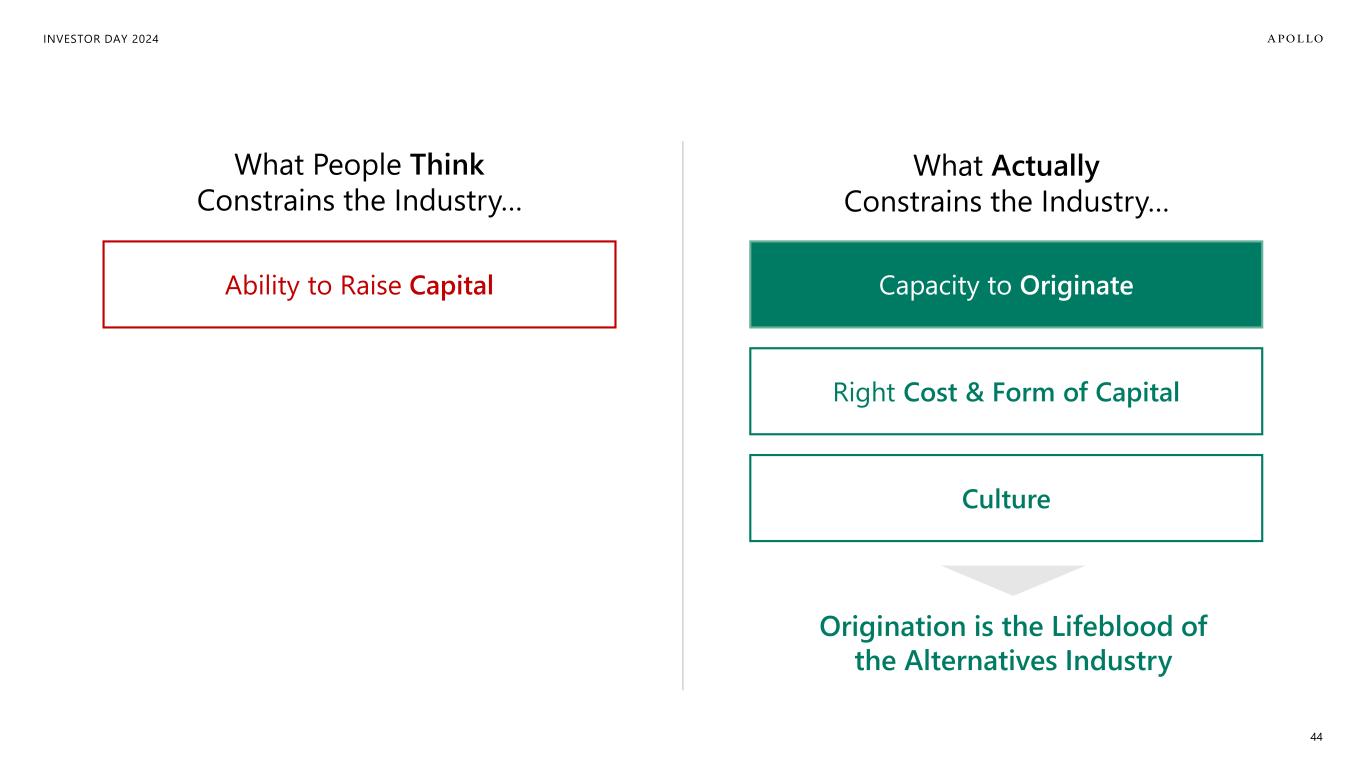 INVESTOR DAY 2024 44 Ability to Raise Capital Right Cost & Form of Capital Capacity to Originate Origination is the Lifeblood of the Alternatives Industry Culture What People Think Constrains the Industry… What Actually Constrains the Industry…