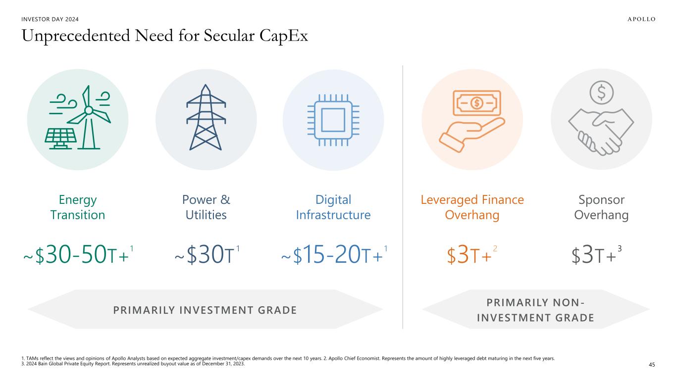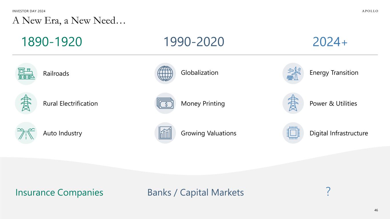 INVESTOR DAY 2024 Unprecedented Need for Secular CapEx 1. TAMs reflect the views and opinions of Apollo Analysts based on expected aggregate investment/capex demands over the next 10 years. 2. Apollo Chief Economist. Represents the amount of highly leveraged debt maturing in the next five years. 3. 2024 Bain Global Private Equity Report. Represents unrealized buyout value as of December 31, 2023. 45 PRIMARILY NON- INVESTMENT GRADE $3T+ 2 $3T+ 3 PRIMARILY INVESTMENT GRADE ~$30-50T+ 1 ~$30T 1 Leveraged Finance Overhang Sponsor Overhang Energy Transition Power & Utilities Digital Infrastructure ~$15-20T+ 1