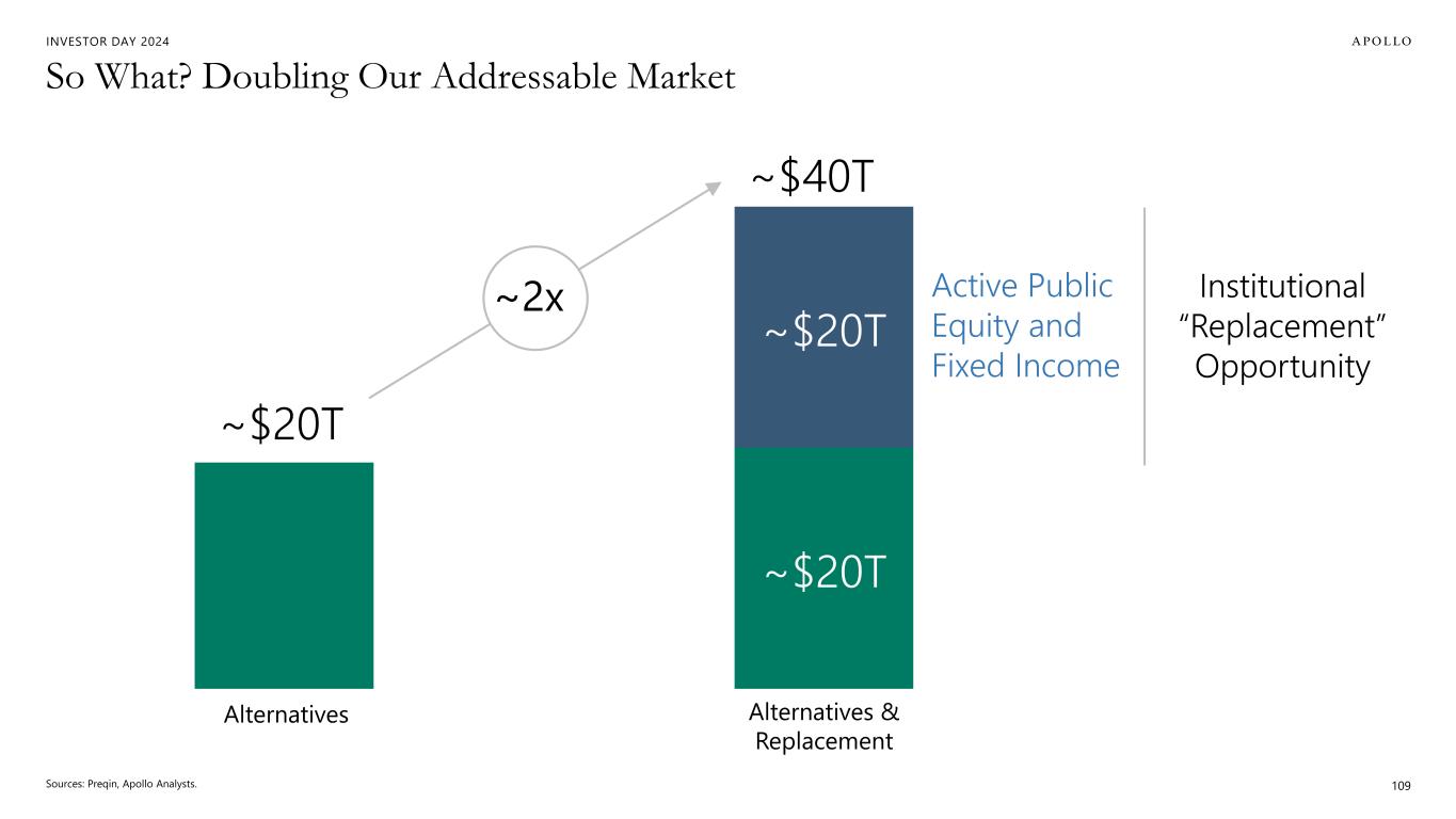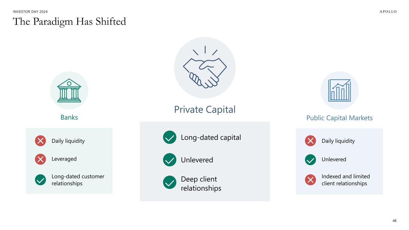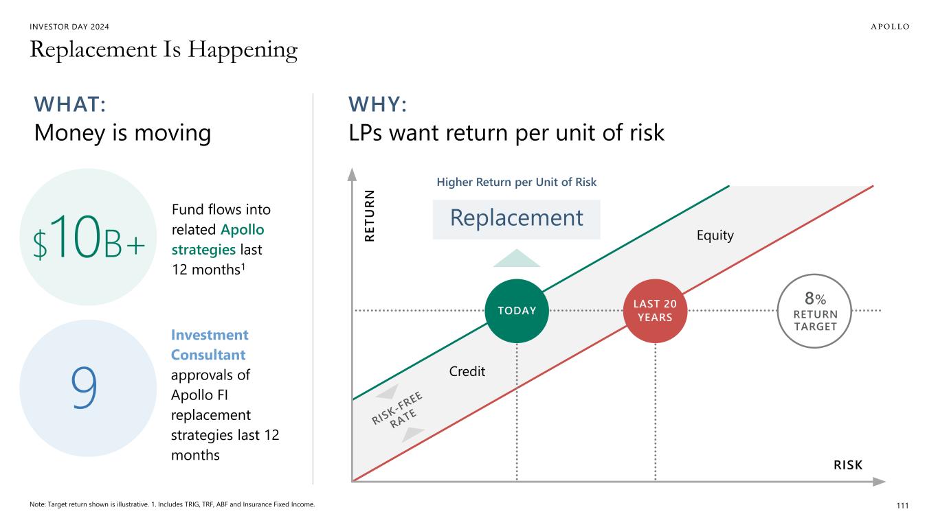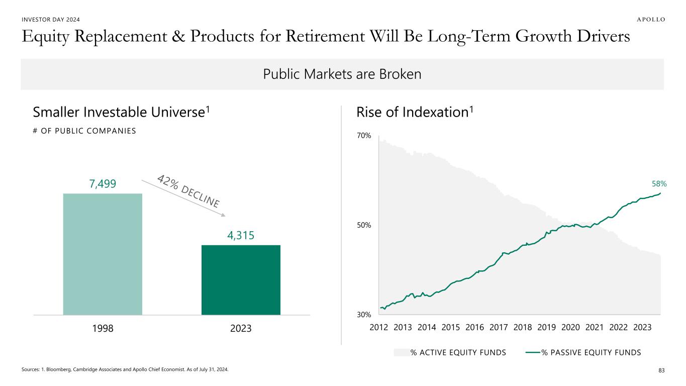 INVESTOR DAY 2024 Equity Replacement & Products for Retirement Will Be Long-Term Growth Drivers Sources: 1. Bloomberg, Cambridge Associates and Apollo Chief Economist. As of July 31, 2024. 83 7,499 4,315 1998 2023 # OF PUBLIC COMPANIES Smaller Investable Universe1 Rise of Indexation1 58% 30% 50% 70% 2012 2013 2014 2015 2016 2017 2018 2019 2020 2021 2022 2023 % ACTIVE EQUITY FUNDS % PASSIVE EQUITY FUNDS Public Markets are Broken