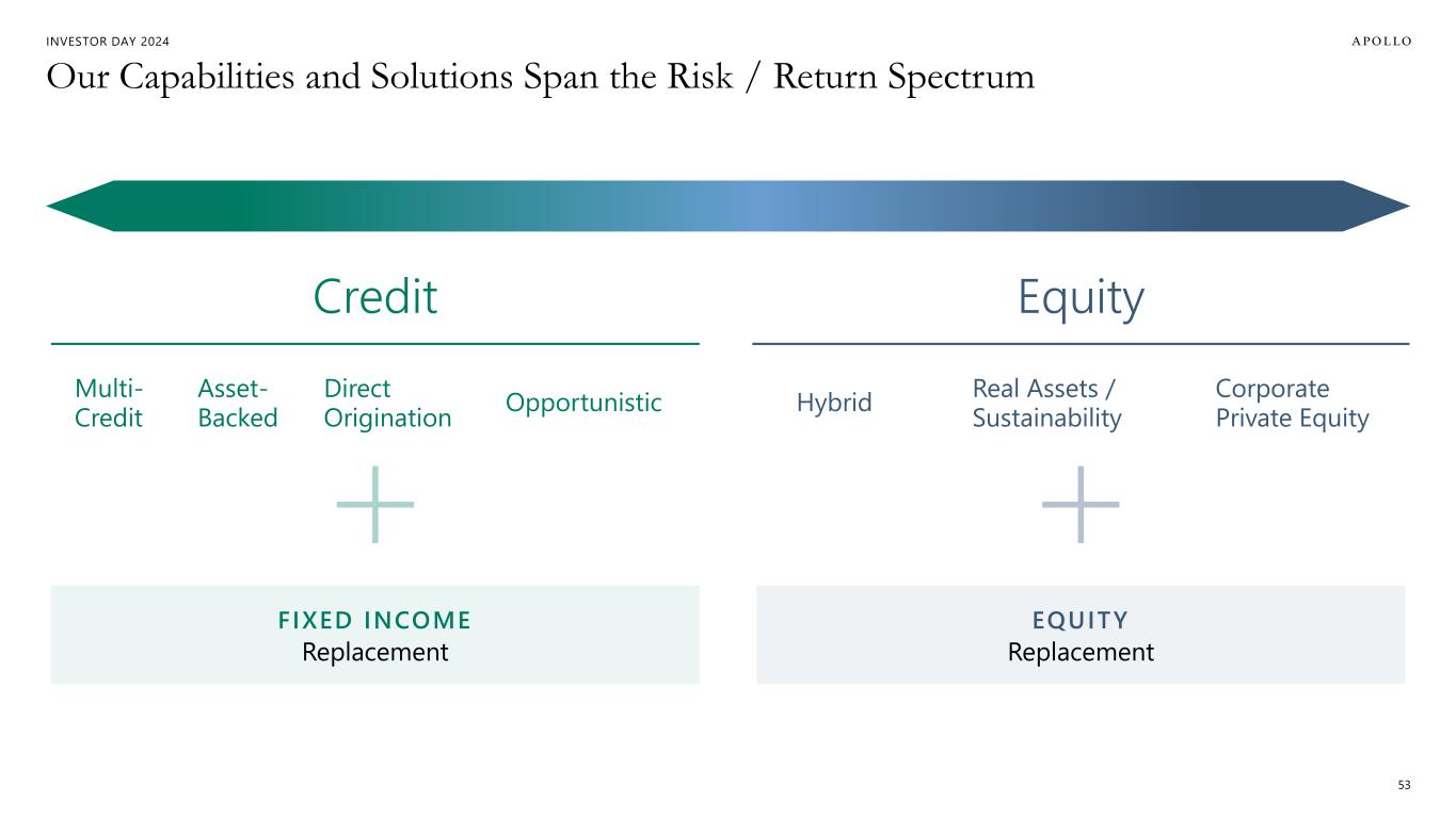 INVESTOR DAY 2024 Our Capabilities and Solutions Span the Risk / Return Spectrum 53 Corporate Private Equity Hybrid Real Assets / Sustainability Multi- Credit Asset- Backed Direct Origination Opportunistic Credit Equity FIXED INCOME Replacement EQUITY Replacement