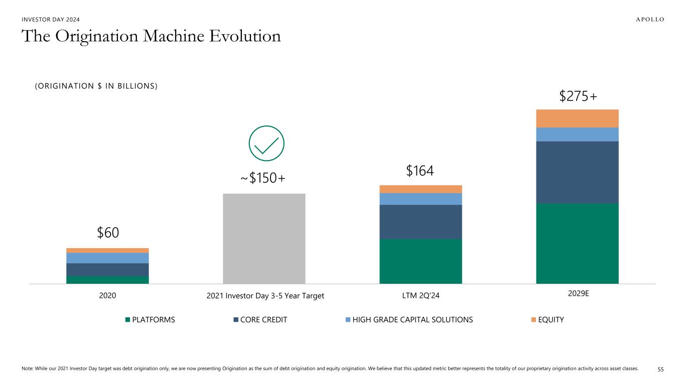 INVESTOR DAY 2024 Shareholder Value from Originated Deal 54 ALPHA GENERATION FOR CLIENTS FRE, SRE, AND PII PROPRIETARY ASSET ORIGINATION Originated Deal To Apollo • Management Fees (FRE) • Capital Solutions Fees (FRE) • Athene Excess Spread (SRE) • Performance Fees (PII) To Investors • Excess Net Return EXCESS RETURN Investor Funds / Third-Party Athene / ADIP Third-Party Syndication