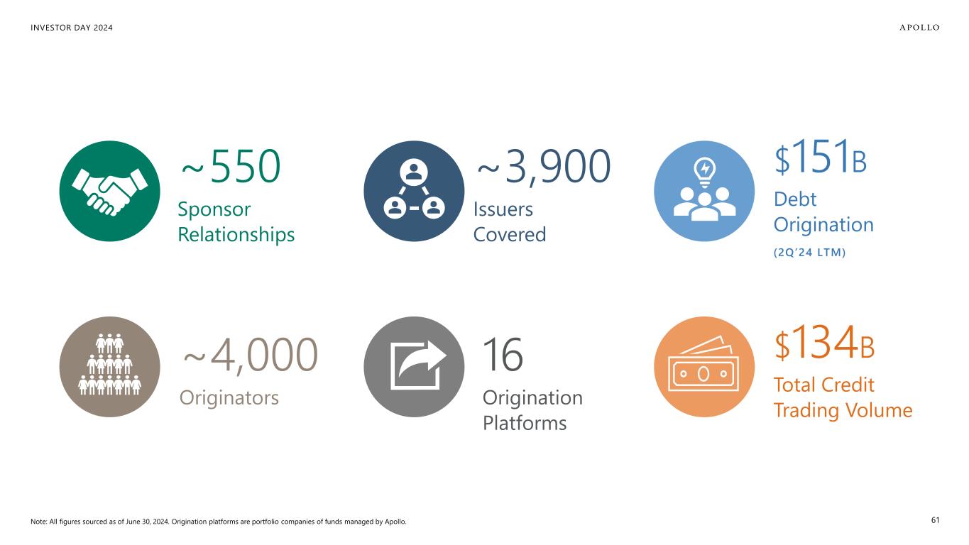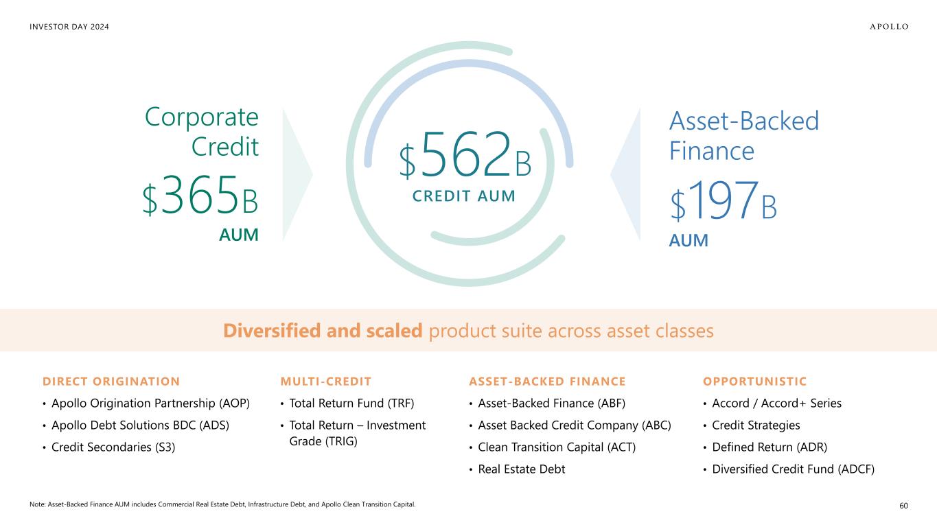 INVESTOR DAY 2024 DIRECT LENDING PREFERRED EQUITY CRE & RMBS TRADE FINANCEEQUIPMENT AVIATION INFRA- STRUCTURE MEDIA RIGHTS PRIVATE INVESTMENT GRADE CONSUMER FLEET MUSIC ROYALTIES SPORTS TRANSFERS WAREHOUSE FUND FINANCE DISTRESSED Traditional Credit 59 Apollo Credit LOANS HY BONDS IG BONDS EMERGING MARKET DEBT CLOS LOANS HY BONDS IG BONDS EMERGING MARKET DEBT CLOS