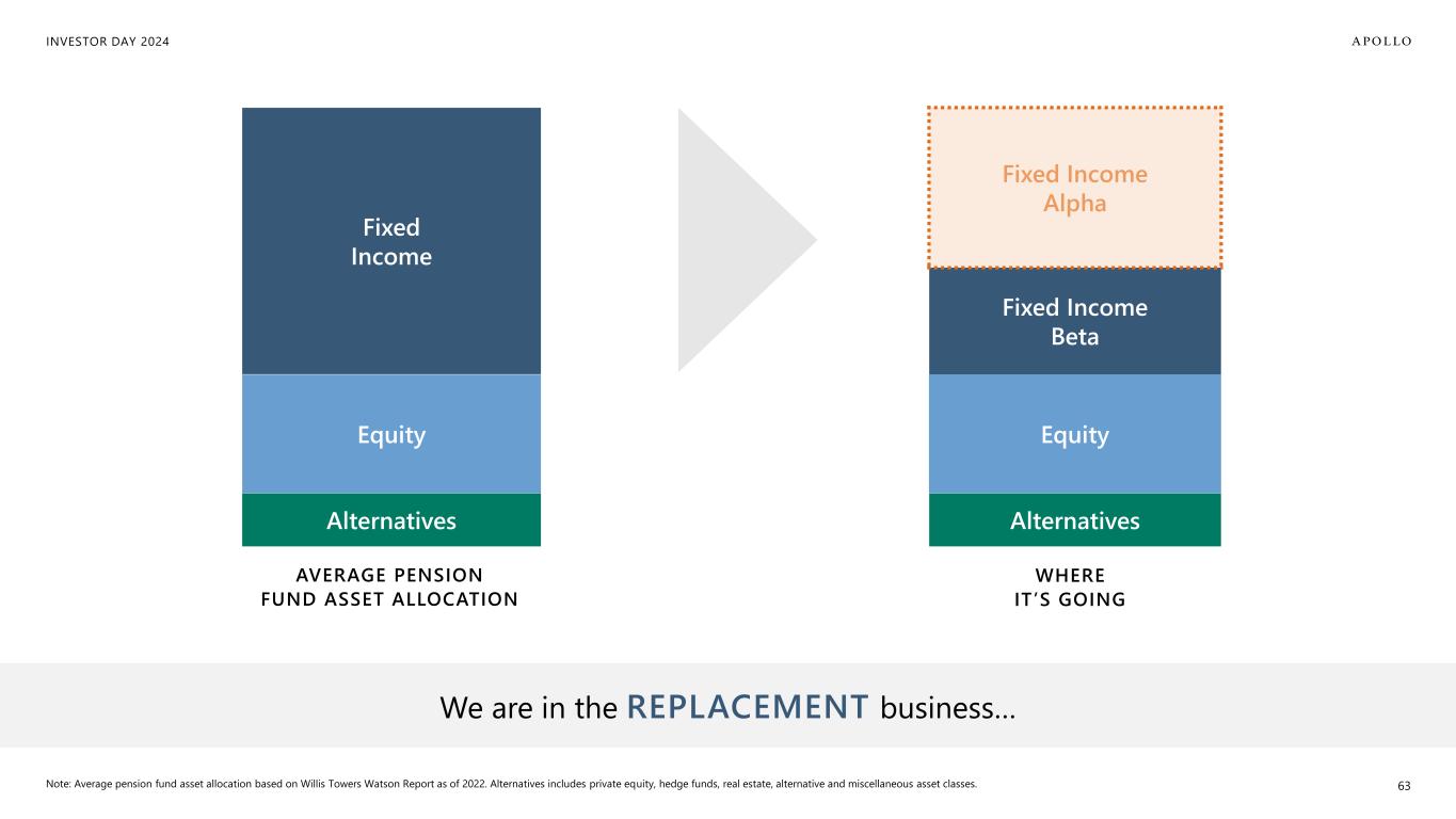 INVESTOR DAY 2024 Note: Average pension fund asset allocation based on Willis Towers Watson Report as of 2022. Alternatives includes private equity, hedge funds, real estate, alternative and miscellaneous asset classes. 63 Fixed Income Fixed Income Alpha Fixed Income Beta Equity Equity Alternatives Alternatives AVERAGE PENSION FUND ASSET ALLOCATION We are in the REPLACEMENT business… WHERE IT’S GOING