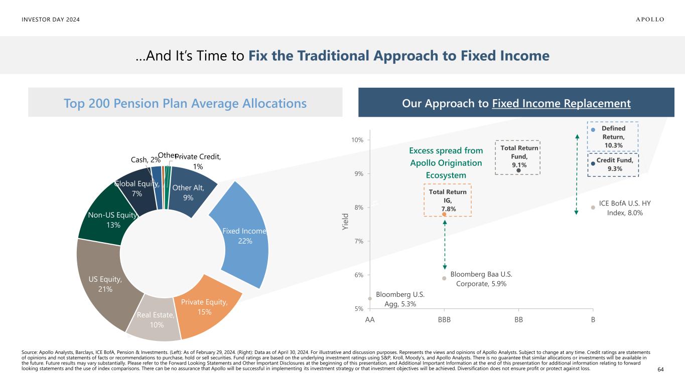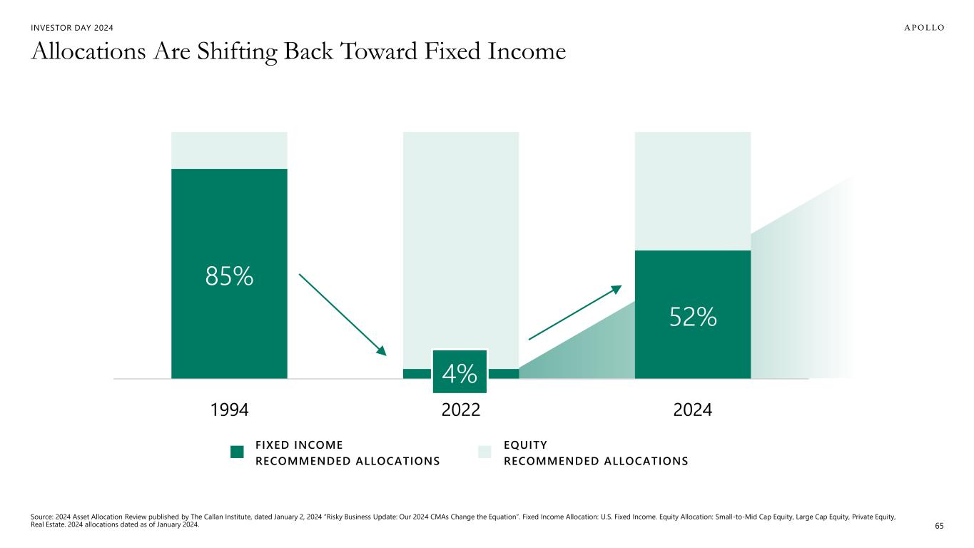 INVESTOR DAY 2024 Excess spread from Apollo Origination Ecosystem Top 200 Pension Plan Average Allocations Bloomberg U.S. Agg, 5.3% Bloomberg Baa U.S. Corporate, 5.9% Total Return IG, 7.8% Total Return Fund, 9.1% Credit Fund, 9.3% Defined Return, 10.3% ICE BofA U.S. HY Index, 8.0% 5% 6% 7% 8% 9% 10% AA BBB BB B Our Approach to Fixed Income Replacement Private Credit, 1% Other Alt, 9% Fixed Income, 22% Private Equity, 15%Real Estate, 10% US Equity, 21% Non-US Equity, 13% Global Equity, 7% Cash, 2% Other … Source: Apollo Analysts, Barclays, ICE BofA, Pension & Investments. (Left): As of February 29, 2024. (Right): Data as of April 30, 2024. For illustrative and discussion purposes. Represents the views and opinions of Apollo Analysts. Subject to change at any time. Credit ratings are statements of opinions and not statements of facts or recommendations to purchase, hold or sell securities. Fund ratings are based on the underlying investment ratings using S&P, Kroll, Moody’s, and Apollo Analysts. There is no guarantee that similar allocations or investments will be available in the future. Future results may vary substantially. Please refer to the Forward Looking Statements and Other Important Disclosures at the beginning of this presentation, and Additional Important Information at the end of this presentation for additional information relating to forward looking statements and the use of index comparisons. There can be no assurance that Apollo will be successful in implementing its investment strategy or that investment objectives will be achieved. Diversification does not ensure profit or protect against loss. 64 …And It’s Time to Fix the Traditional Approach to Fixed Income Y ie ld
