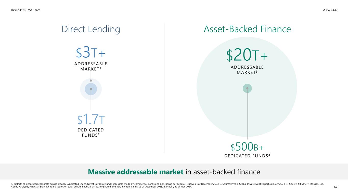 INVESTOR DAY 2024 Note: For illustrative purposes only. Reflects views and opinions of Apollo Analysts. Sources include ICE, Bank of America, Preqin and PitchBook LCD. 1. Defined as high-yield and leveraged finance market size. 66 Sub-IG Market1 Investment Grade Market Significant untapped potential within the IG markets ~$1T ~$3T Private Market’s Share ~3x ~$9T Private Markets Barely Perceptible