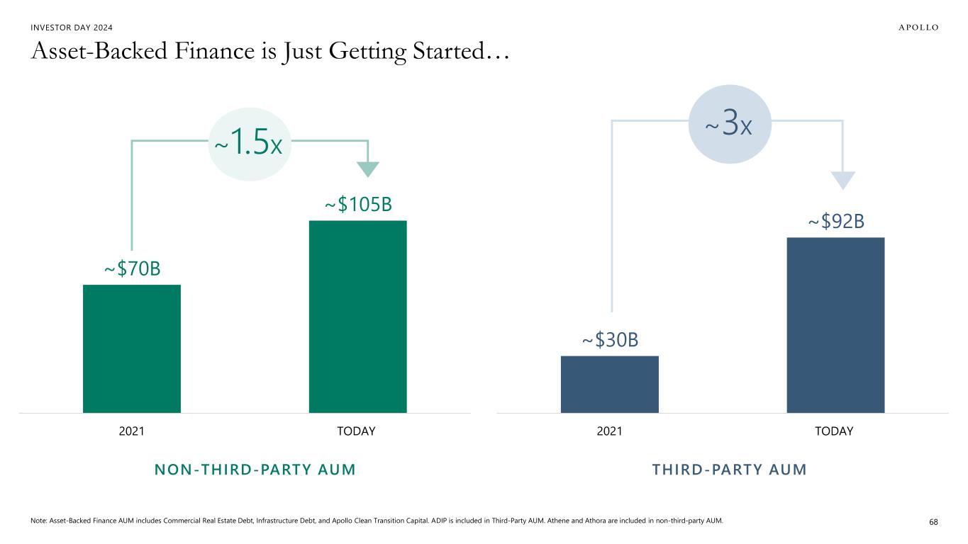 INVESTOR DAY 2024 $1.7T DEDICATED FUNDS 2 $500B+ DEDICATED FUNDS 4 $20T+ ADDRESSABLE MARKET 3 1. Reflects all unsecured corporate across Broadly Syndicated Loans, Direct Corporate and High-Yield made by commercial banks and non-banks per Federal Reserve as of December 2023. 2. Source: Preqin Global Private Debt Report, January 2024. 3. Source: SIFMA, JP Morgan, Citi, Apollo Analysts, Financial Stability Board report on total private financial assets originated and held by non-banks, as of December 2023. 4. Preqin, as of May 2024. 67 $3T+ ADDRESSABLE MARKET 1 Direct Lending Asset-Backed Finance Massive addressable market in asset-backed finance