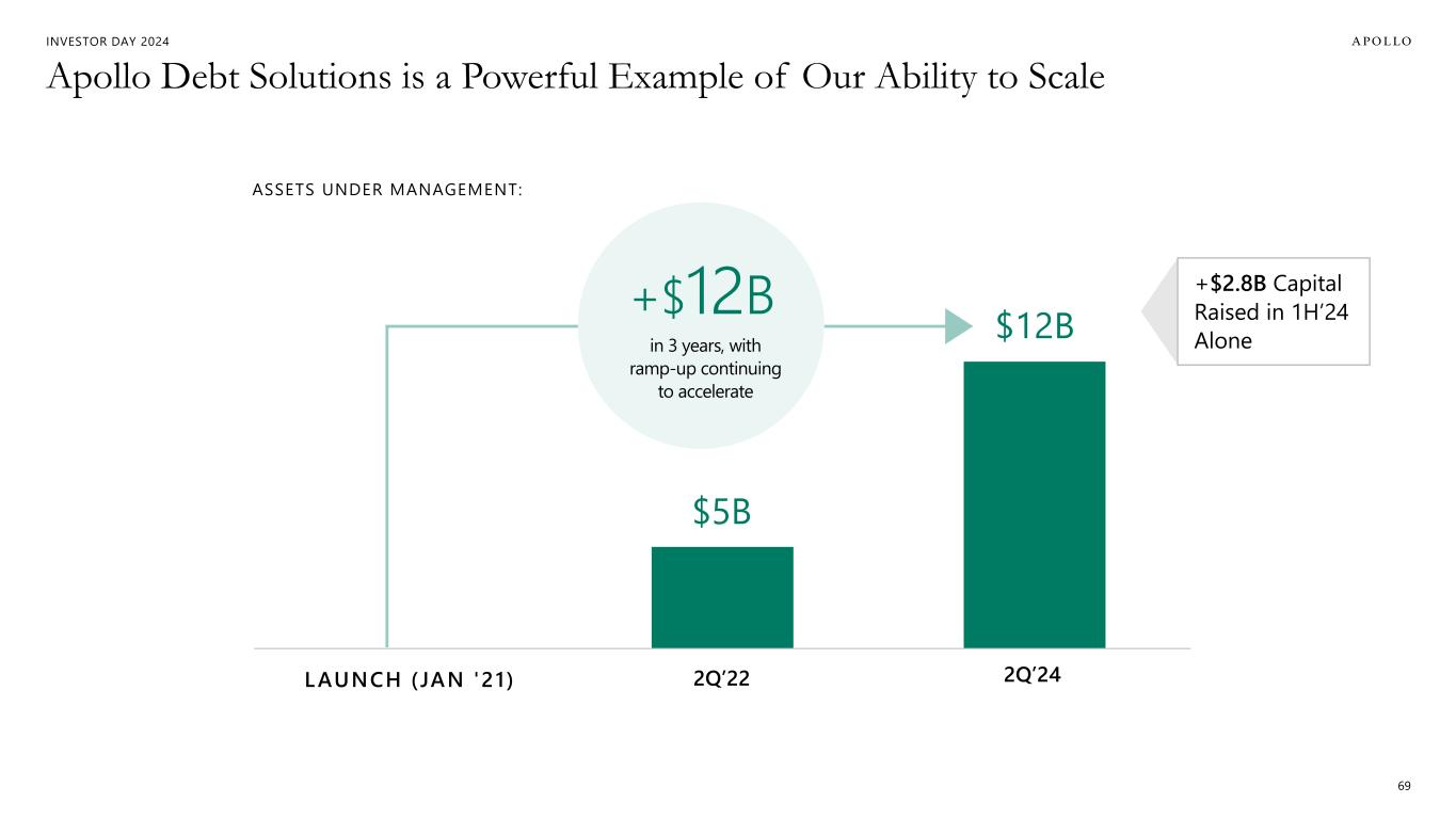 INVESTOR DAY 2024 Note: Asset-Backed Finance AUM includes Commercial Real Estate Debt, Infrastructure Debt, and Apollo Clean Transition Capital. ADIP is included in Third-Party AUM. Athene and Athora are included in non-third-party AUM. 68 Asset-Backed Finance is Just Getting Started… THIRD-PARTY AUMNON-THIRD-PARTY AUM ~1.5x ~$70B ~$105B 2021 TODAY ~$30B ~$92B 2021 TODAY ~3x
