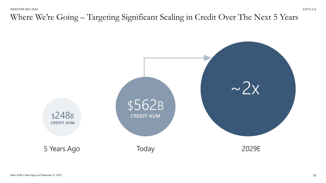 INVESTOR DAY 2024 $4B $12B LAUNCH (JAN '21) 2Q22 2Q24 $5B in 3 years, with ramp-up continuing to accelerate +$12B +$2.8B Capital Raised in 1H’24 Alone 69 Apollo Debt Solutions is a Powerful Example of Our Ability to Scale ’ ASSETS UNDER MANAGEMENT: 2 ’24