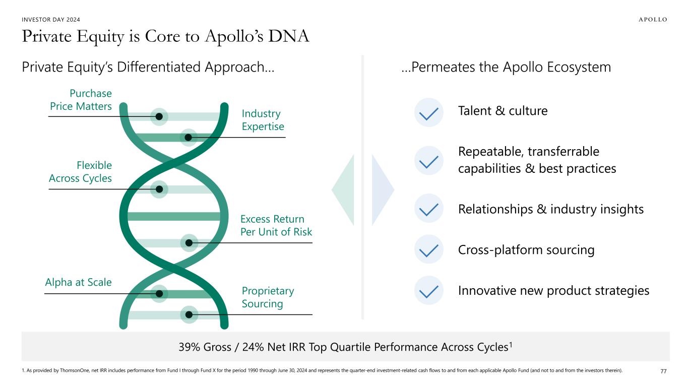 INVESTOR DAY 2024 Can the Private Equity Industry Adapt? Source: 1. Bain & Company Global Private Equity Report 2024; represents 2013-2023 time frame. For illustrative purposes only and does not represent any actual Apollo Funds’ investment. Based on the views and opinions of Apollo Analysts. “Apollo’s Illustrative Value Creation Bridge” is premised upon core private equity investment principles, including without limitation the prioritization of cash flow and operational improvements (e.g., capital structure optimization and EBITDA growth) as key sources of value creation. 2. X (Twitter) as of July 7th, 2024 (@BoringBiz_). 76 47% 53% <1% FCF GENERATION/OPERATIONAL IMPROVEMENT MARKET/REVENUE GROWTH MULTIPLE EXPANSION Industry1 Apollo “Alpha” “Beta” It was not just a decade of low interest rates and high leverage … … you added real operational value to your portfolio companies2