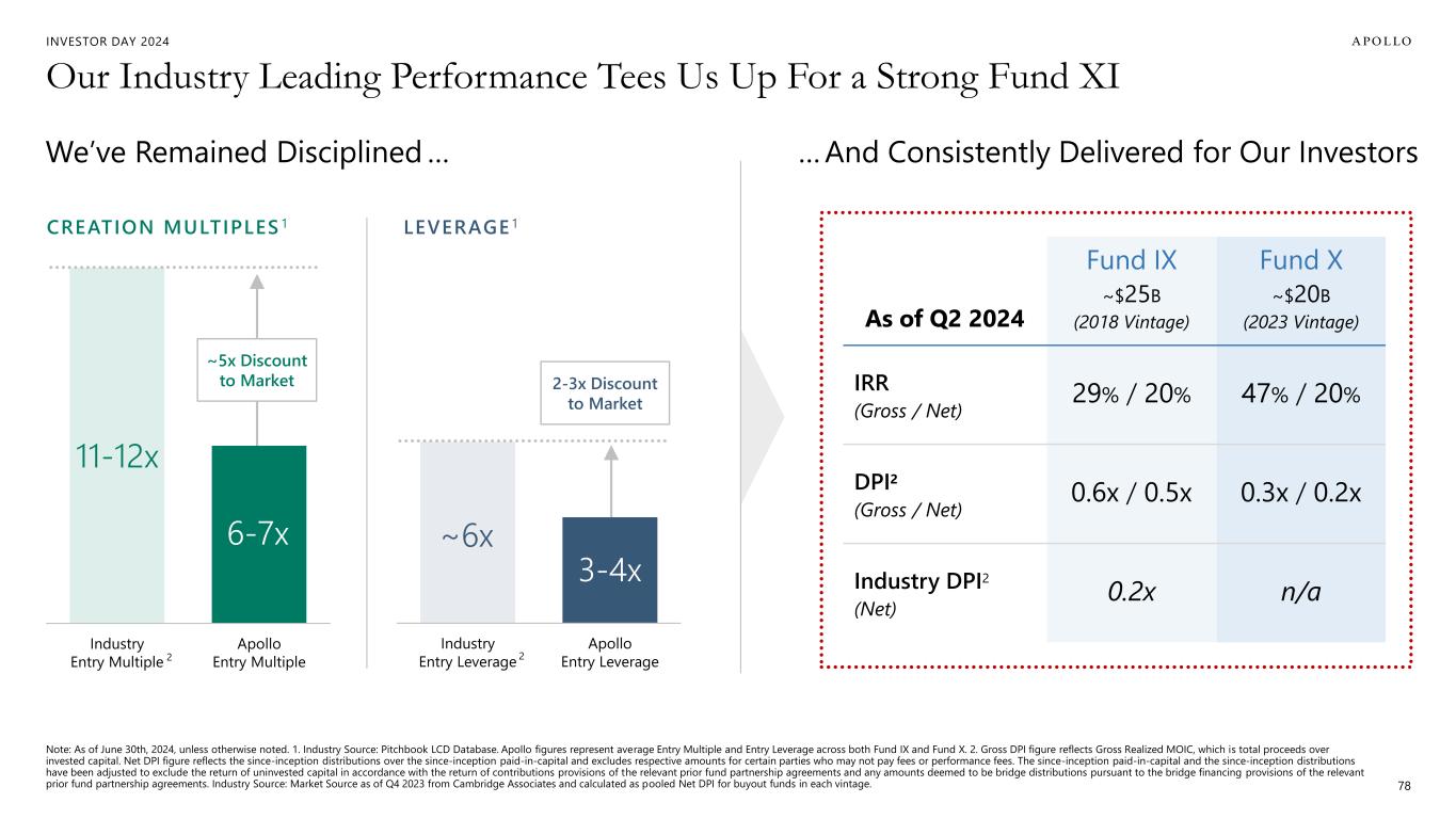 INVESTOR DAY 2024 Private Equity is Core to Apollo’s DNA 1. As provided by ThomsonOne, net IRR includes performance from Fund I through Fund X for the period 1990 through June 30, 2024 and represents the quarter-end investment-related cash flows to and from each applicable Apollo Fund (and not to and from the investors therein). 77 …Permeates the Apollo EcosystemPrivate Equity’s Differentiated Approach… Talent & culture Repeatable, transferrable capabilities & best practices Relationships & industry insights Cross-platform sourcing Innovative new product strategies Purchase Price Matters Flexible Across Cycles Alpha at Scale Proprietary Sourcing Excess Return Per Unit of Risk Industry Expertise 39% Gross / 24% Net IRR Top Quartile Performance Across Cycles1