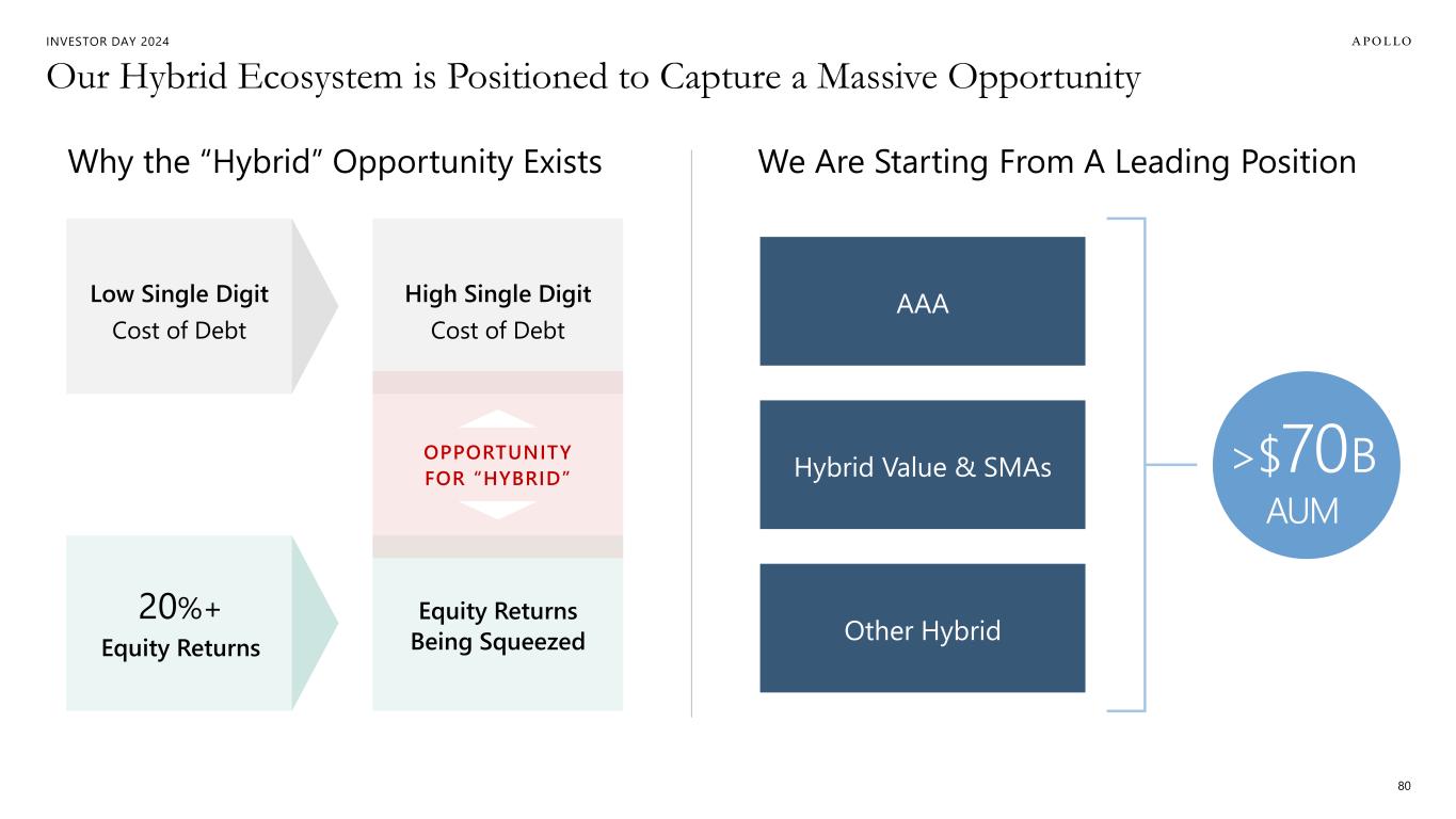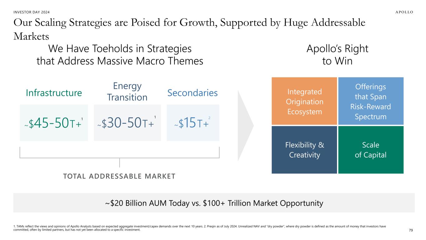 INVESTOR DAY 2024 Our Scaling Strategies are Poised for Growth, Supported by Huge Addressable Markets 1. TAMs reflect the views and opinions of Apollo Analysts based on expected aggregate investment/capex demands over the next 10 years. 2. Preqin as of July 2024. Unrealized NAV and “dry powder”, where dry powder is defined as the amount of money that investors have committed, often by limited partners, but has not yet been allocated to a specific investment. 79 We Have Toeholds in Strategies that Address Massive Macro Themes Apollo’s Right to Win ~$20 Billion AUM Today vs. $100+ Trillion Market Opportunity TOTAL ADDRESSABLE MARKET Energy Transition SecondariesInfrastructure ~$30-50 T+ 1 ~$15 T+ 2 ~$45-50 T+ 1 Integrated Origination Ecosystem Offerings that Span Risk-Reward Spectrum Flexibility & Creativity Scale of Capital
