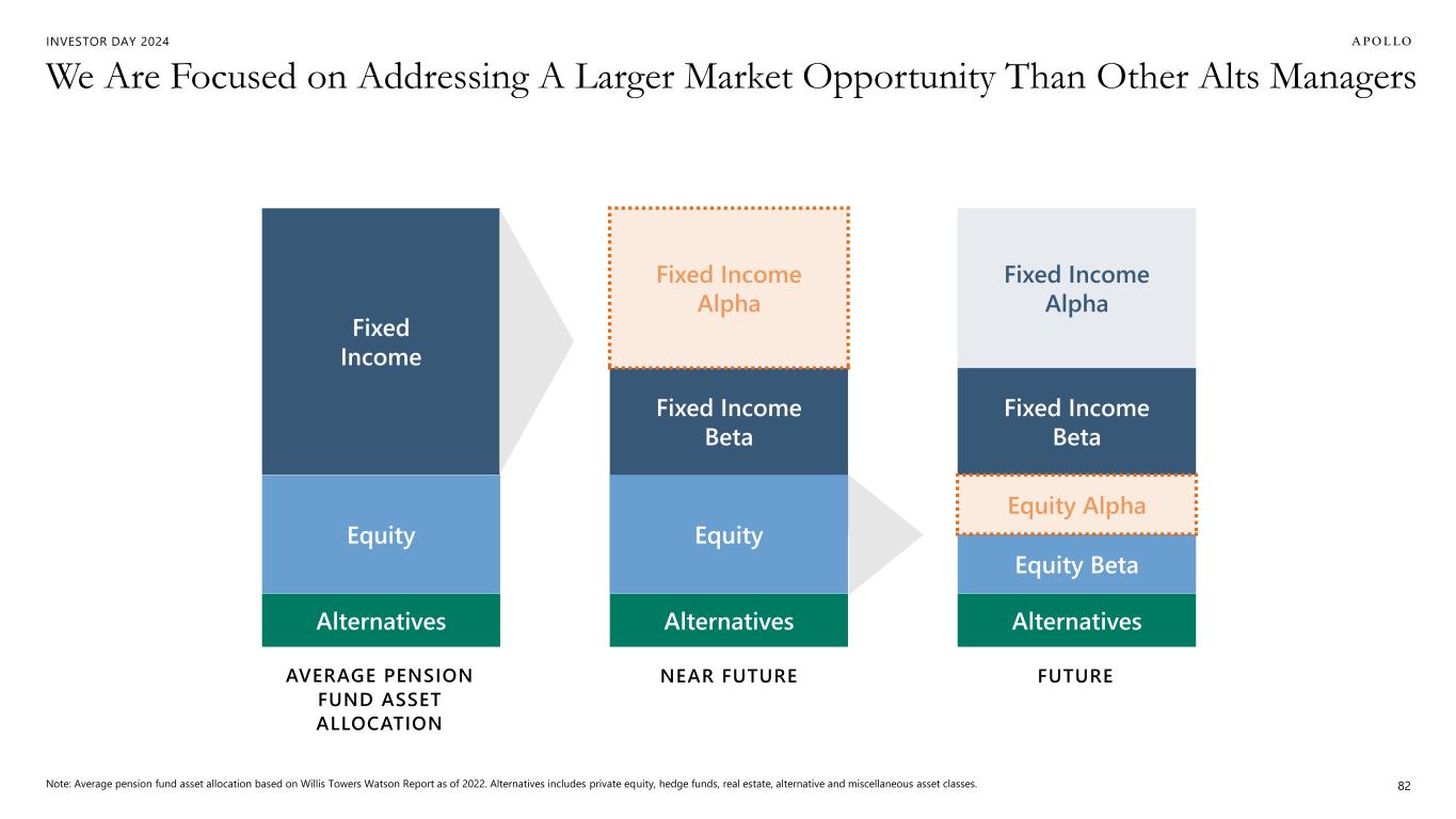 INVESTOR DAY 2024 Two Years Ago Today Future AAA: A Unique Product Driving Growth 1. Data as of June 30, 2022. 2. Data as of June 30, 2024, including 3Q’24 anticipated subscriptions. 3. Data as of June 30, 2024. Represents the performance of the AAA Strategy from March 2015 through 1Q’22, and the performance of Apollo Aligned Alternatives from April 2022 through June 30, 2024. The Inception Date of Apollo Aligned Alternatives was April 1, 2022. The period FY 2015 – 1Q’22 represents an illustrative track record of positions that are intended to represent positions that would have been included in AAA had it been in place. 81 Key HighlightsApollo Aligned Alternatives (AAA) NET ASSET VALUE (NAV) $8B $18B 1 2 Winning Strategy 10-Year Track Record of Excellence Apollo’s Balance Sheet Investing Strategy Hybrid Risk-Reward Investor-Friendly Structure and Fees For Institutional, Wealth & Retirement (401(k)) Markets Low Double Digit Net Returns <5% Volatility One Down Quarter Over 40 Quarters3 Apollo Balance Sheet Third-Party Investors
