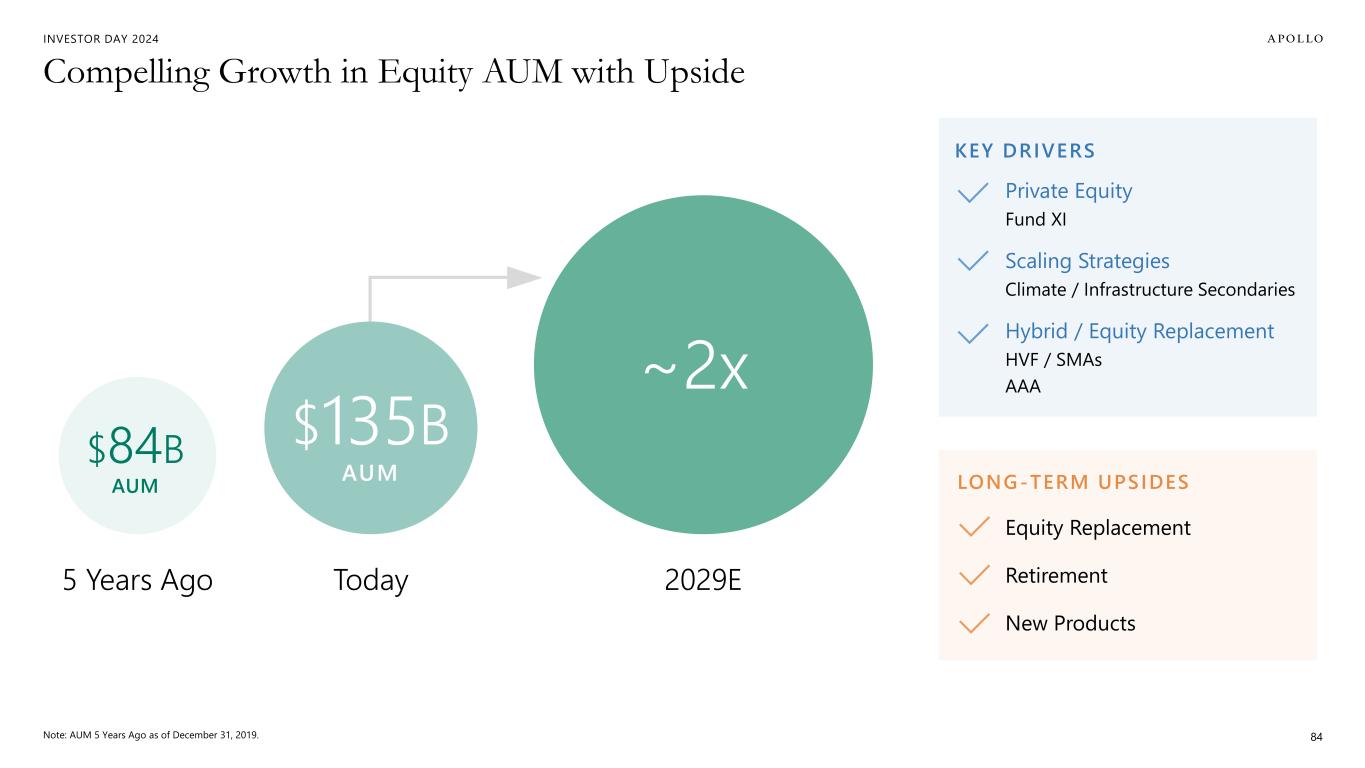 INVESTOR DAY 2024 Compelling Growth in Equity AUM with Upside Note: AUM 5 Years Ago as of December 31, 2019. 84 Today 2029E5 Years Ago $84B AUM ~2x $135B AUM Private Equity Fund XI Scaling Strategies Climate / Infrastructure Secondaries Hybrid / Equity Replacement HVF / SMAs AAA KEY DRIVERS LONG-TERM UPSIDES Equity Replacement Retirement New Products
