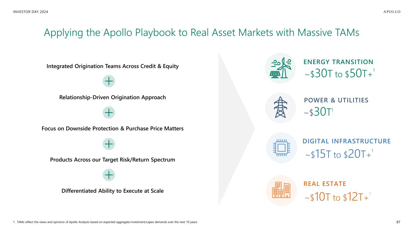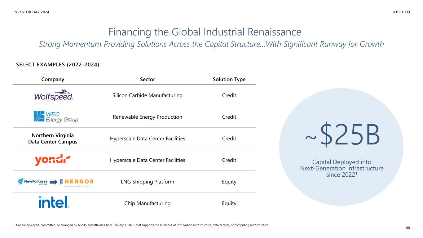 INVESTOR DAY 2024 1. TAMs reflect the views and opinions of Apollo Analysts based on expected aggregate investment/capex demands over the next 10 years. ENERGY TRANSITION ~$30T to $50T+ 1 POWER & UTILITIES ~$30T1 DIGITAL INFRASTRUCTURE ~$15T to $20T+ 1 REAL ESTATE ~$10T to $12T+ 1 Applying the Apollo Playbook to Real Asset Markets with Massive TAMs Integrated Origination Teams Across Credit & Equity Relationship-Driven Origination Approach Focus on Downside Protection & Purchase Price Matters Products Across our Target Risk/Return Spectrum Differentiated Ability to Execute at Scale 87