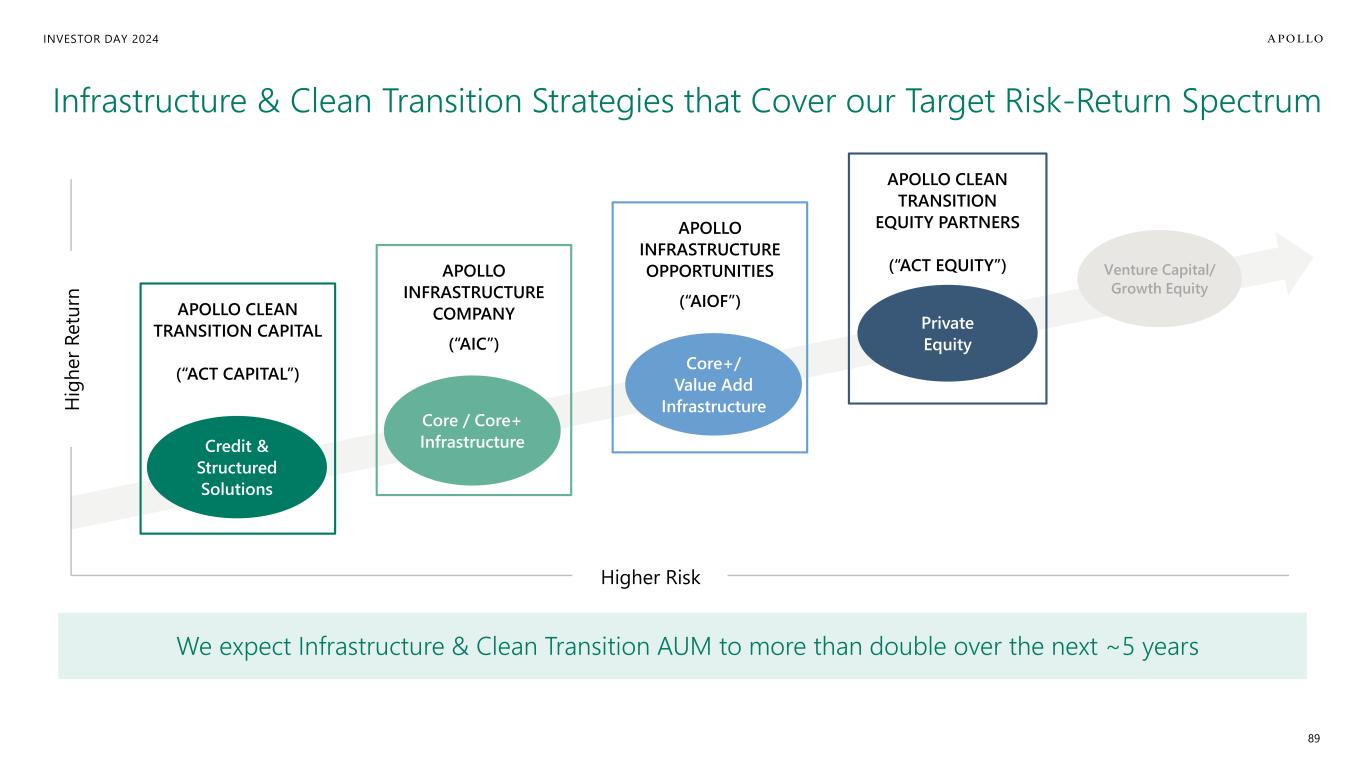 INVESTOR DAY 2024 88 Financing the Global Industrial Renaissance ~$25B Capital Deployed into Next-Generation Infrastructure since 20221 Company Sector Solution Type Silicon Carbide Manufacturing Credit Renewable Energy Production Credit Northern Virginia Data Center Campus Hyperscale Data Center Facilities Credit Hyperscale Data Center Facilities Credit LNG Shipping Platform Equity Chip Manufacturing Equity SELECT EXAMPLES (2022-2024) 1. Capital deployed, committed, or arranged by Apollo and affiliates since January 1, 2022, that supports the build out of low-carbon infrastructure, data centers, or computing infrastructure. Strong Momentum Providing Solutions Across the Capital Structure…With Significant Runway for Growth