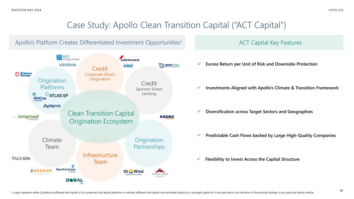 INVESTOR DAY 2024 Climate Team Credit Corporate Direct OriginationOrigination Platforms Credit Sponsor Direct Lending Case Study: Apollo Clean Transition Capital (“ACT Capital”) 90 ACT Capital Key FeaturesApollo’s Platform Creates Differentiated Investment Opportunities1 Origination Partnerships Infrastructure Team Clean Transition Capital Origination Ecosystem ✓ Diversification across Target Sectors and Geographies ✓ Excess Return per Unit of Risk and Downside-Protection ✓ Investments Aligned with Apollo’s Climate & Transition Framework ✓ Predictable Cash Flows backed by Large High-Quality Companies ✓ Flexibility to Invest Across the Capital Structure 1. Logos represent either (i) platforms affiliated with Apollo or (ii) companies that Apollo platforms or vehicles affiliated with Apollo have provided capital to or arranged capital for in the past and is not indicative of the existing holdings of any particular Apollo vehicle.
