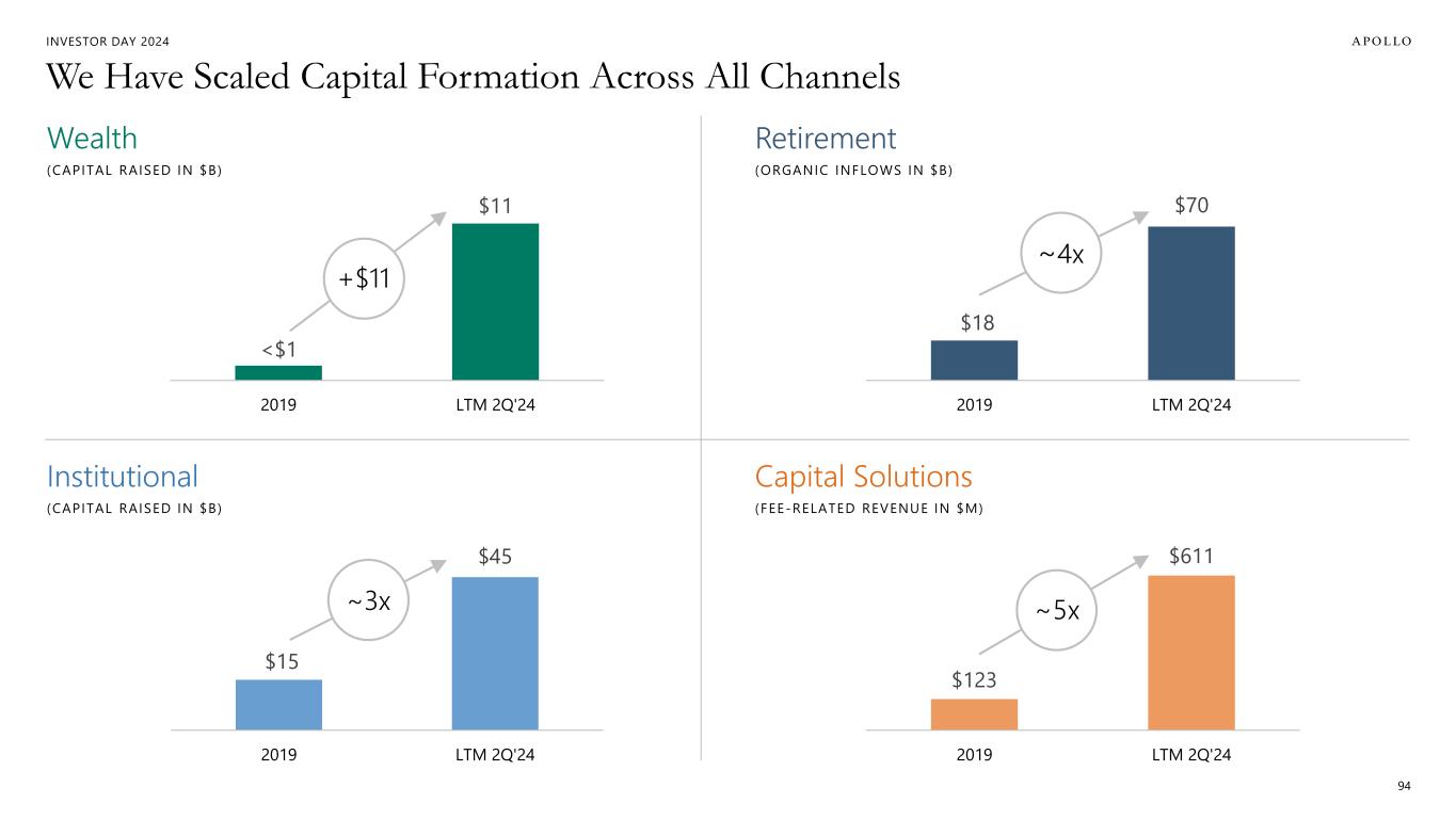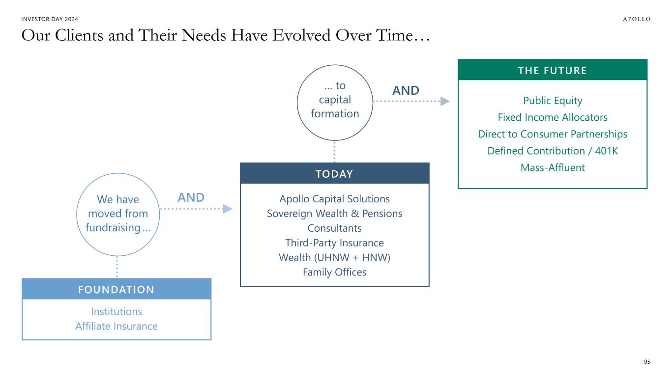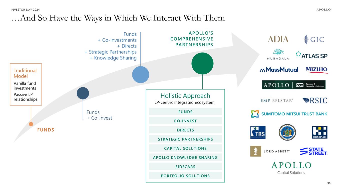 INVESTOR DAY 2024 Our Clients and Their Needs Have Evolved Over Time… 95 Public Equity Fixed Income Allocators Direct to Consumer Partnerships Defined Contribution / 401K Mass-Affluent THE FUTURE Apollo Capital Solutions Sovereign Wealth & Pensions Consultants Third-Party Insurance Wealth (UHNW + HNW) Family Offices TODAY Institutions Affiliate Insurance FOUNDATION We have moved from fundraising … … to capital formation AND AND