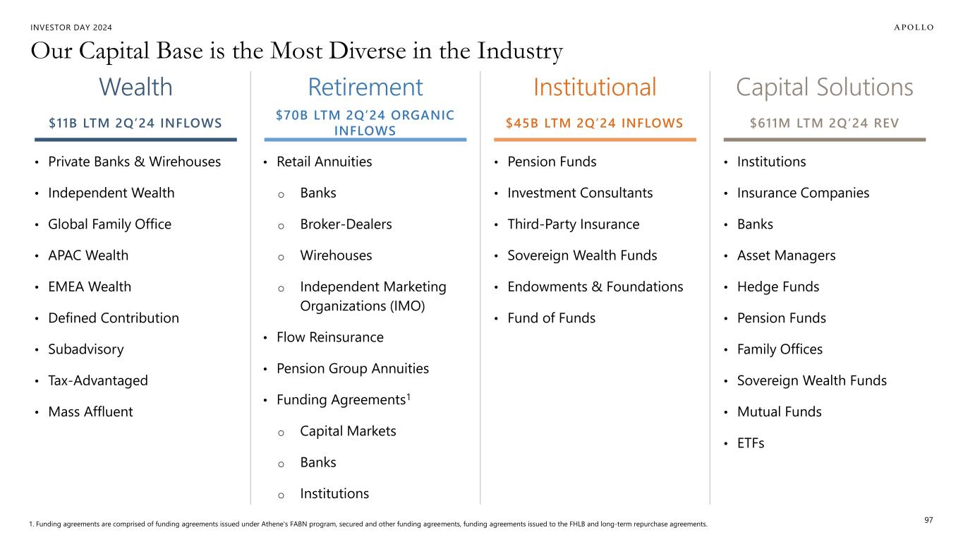 INVESTOR DAY 2024 Our Capital Base is the Most Diverse in the Industry 97 Wealth $11B LTM 2Q’24 INFLOWS Retirement $70B LTM 2Q’24 ORGANIC INFLOWS Institutional $45B LTM 2Q’24 INFLOWS Capital Solutions $611M LTM 2Q‘24 REV • Private Banks & Wirehouses • Independent Wealth • Global Family Office • APAC Wealth • EMEA Wealth • Defined Contribution • Subadvisory • Tax-Advantaged • Mass Affluent • Retail Annuities o Banks o Broker-Dealers o Wirehouses o Independent Marketing Organizations (IMO) • Flow Reinsurance • Pension Group Annuities • Funding Agreements1 o Capital Markets o Banks o Institutions • Pension Funds • Investment Consultants • Third-Party Insurance • Sovereign Wealth Funds • Endowments & Foundations • Fund of Funds • Institutions • Insurance Companies • Banks • Asset Managers • Hedge Funds • Pension Funds • Family Offices • Sovereign Wealth Funds • Mutual Funds • ETFs 1. Funding agreements are comprised of funding agreements issued under Athene's FABN program, secured and other funding agreements, funding agreements issued to the FHLB and long-term repurchase agreements.