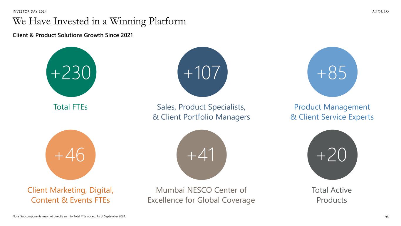 INVESTOR DAY 2024 We Have Invested in a Winning Platform Note: Subcomponents may not directly sum to Total FTEs added. As of September 2024. 98 Sales, Product Specialists, & Client Portfolio Managers Product Management & Client Service Experts Client Marketing, Digital, Content & Events FTEs Mumbai NESCO Center of Excellence for Global Coverage Total FTEs Total Active Products +230 +107 +85 +46 +41 +20 Client & Product Solutions Growth Since 2021