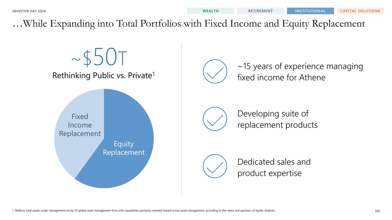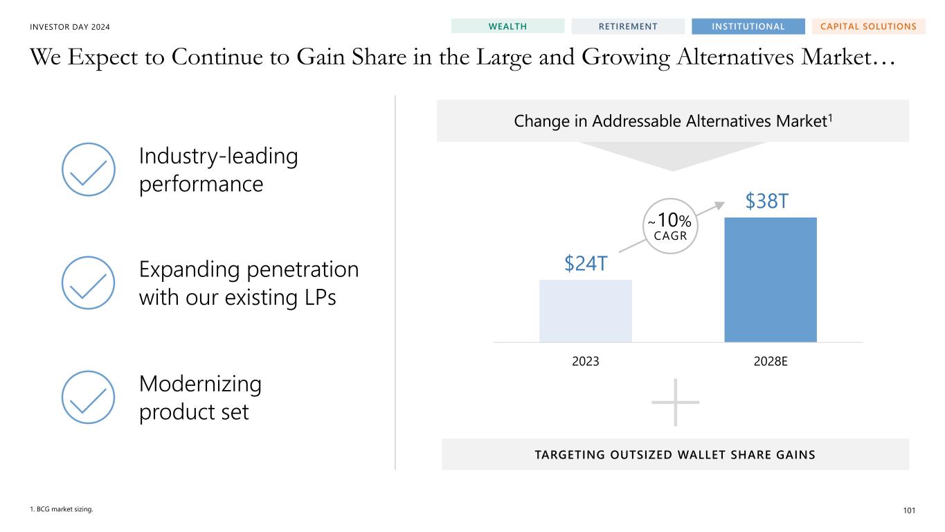 INVESTOR DAY 2024 $24T $38T 2023 2028E We Expect to Continue to Gain Share in the Large and Growing Alternatives Market… 1. BCG market sizing. 101 WEALTH RETIREMENT INSTITUTIONAL CAPITAL SOLUTIONS ~10% CAGR TARGETING OUTSIZED WALLET SHARE GAINS Industry-leading performance Expanding penetration with our existing LPs Modernizing product set Change in Addressable Alternatives Market1