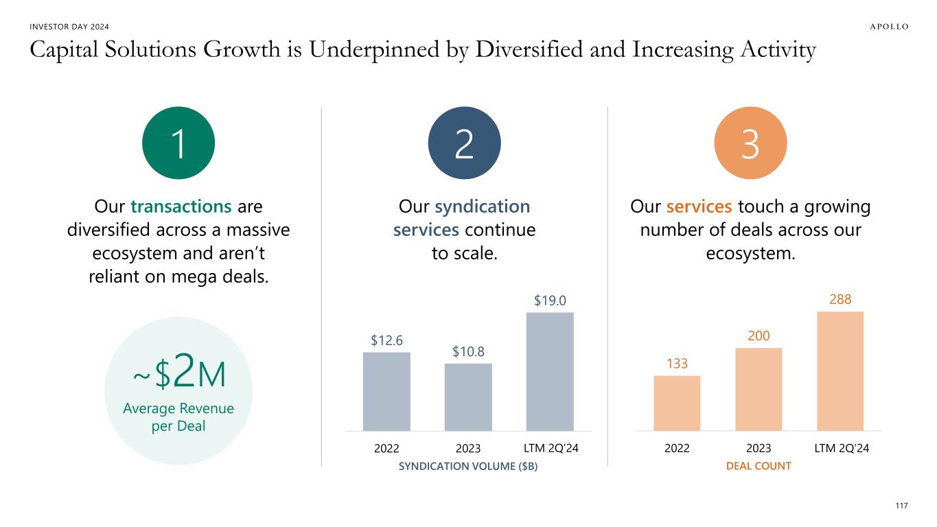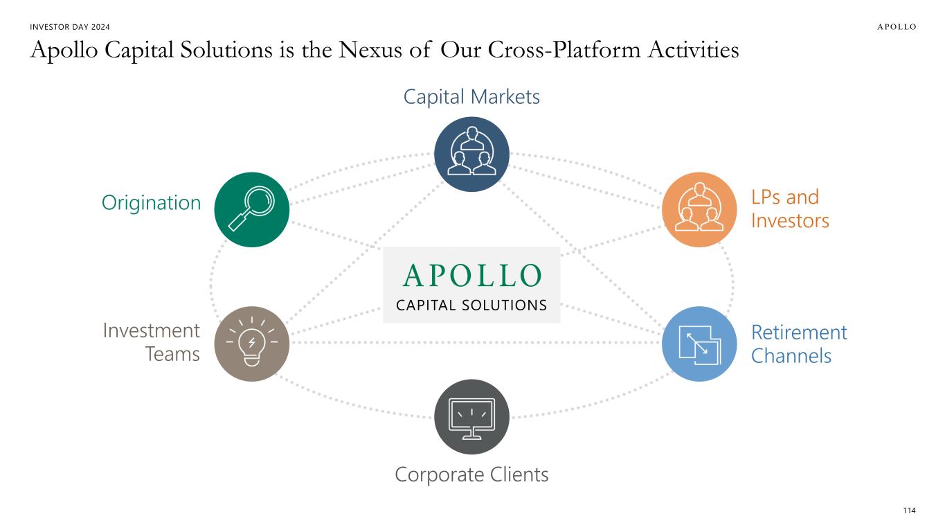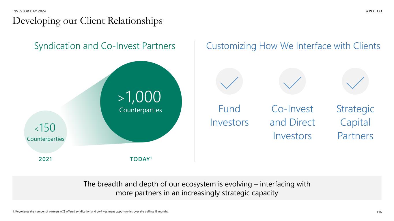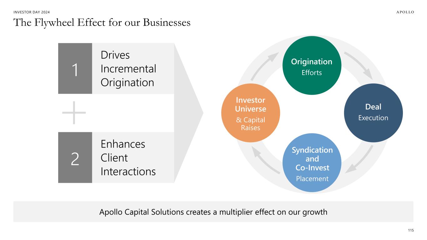 INVESTOR DAY 2024 The Flywheel Effect for our Businesses 115 Apollo Capital Solutions creates a multiplier effect on our growth Drives Incremental Origination 1 Enhances Client Interactions 2 Investor Universe & Capital Raises Origination Efforts Deal Execution Syndication and Co-Invest Placement