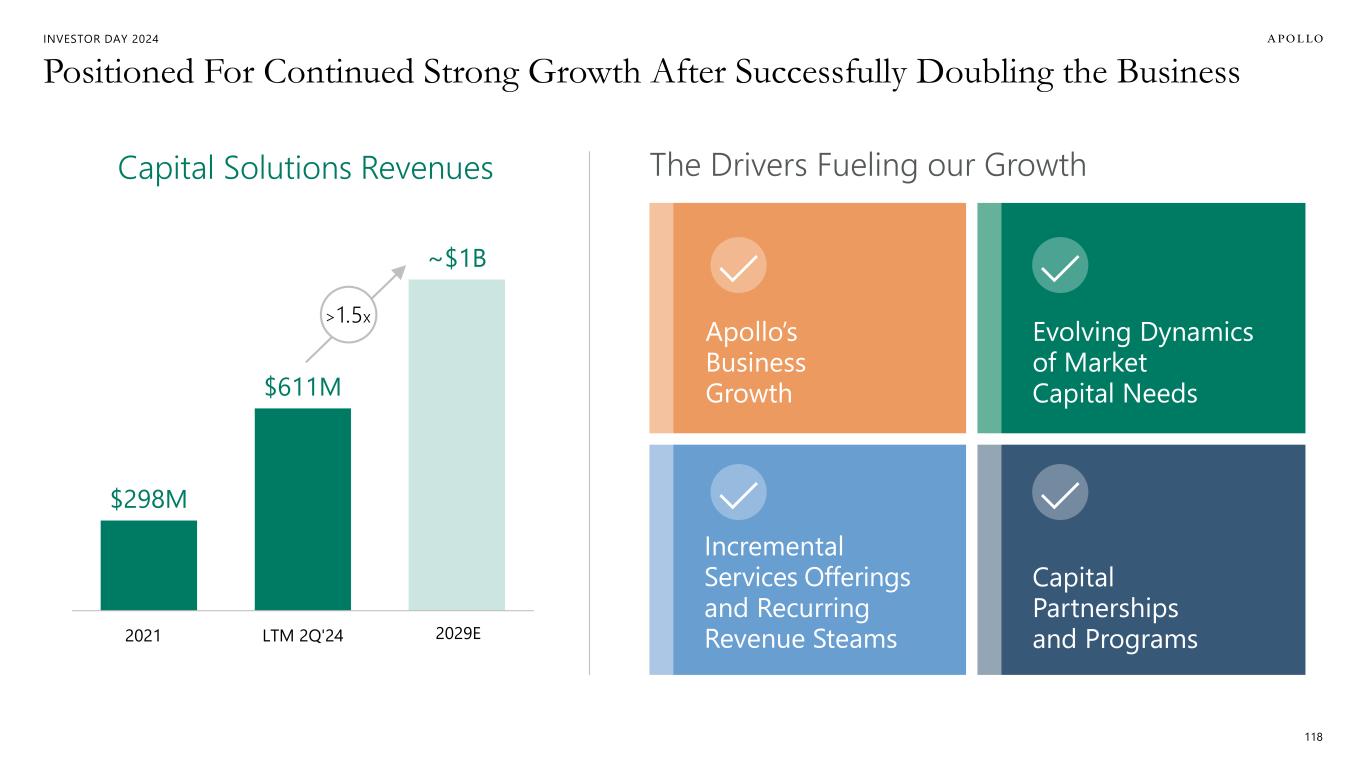 INVESTOR DAY 2024 Positioned For Continued Strong Growth After Successfully Doubling the Business 118 The Drivers Fueling our Growth $298M $611M ~$1B 2021A LTM 2Q'24 ~5 Year Target Capital Solutions Revenues Apollo’s Business Growth Evolving Dynamics of Market Capital Needs Incremental Services Offerings and Recurring Revenue Steams Capital Partnerships and Programs >1.5x 2029E