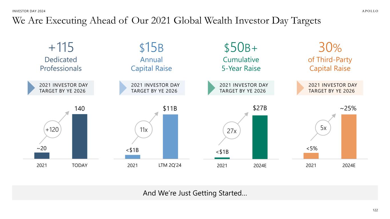 INVESTOR DAY 2024 We Are Executing Ahead of Our 2021 Global Wealth Investor Day Targets 122 2021 2024E $27B 2021 TODAY 140 2021 2024E <5% ~25% 2021 LTM Q2'24 <$1B $11B 27x+120 5x11x 2021 INVESTOR DAY TARGET BY YE 2026 +115 Dedicated Professionals 2021 INVESTOR DAY TARGET BY YE 2026 30% of Third-Party Capital Raise 2021 INVESTOR DAY TARGET BY YE 2026 $15B Annual Capital Raise 2021 INVESTOR DAY TARGET BY YE 2026 $50B+ Cumulative 5-Year Raise And We’re Just Getting Started… ~20 <$1B 2Q’