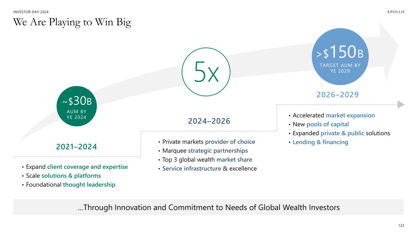 INVESTOR DAY 2024 2026–2029 2021–2024 2024–2026 …Through Innovation and Commitment to Needs of Global Wealth Investors ~$30B AUM BY YE 2024 >$150 B TARGET AUM BY YE 2029 We Are Playing to Win Big 123 5x • Accelerated market expansion • New pools of capital • Expanded private & public solutions • Lending & financing • Expand client coverage and expertise • Scale solutions & platforms • Foundational thought leadership • Private markets provider of choice • Marquee strategic partnerships • Top 3 global wealth market share • Service infrastructure & excellence