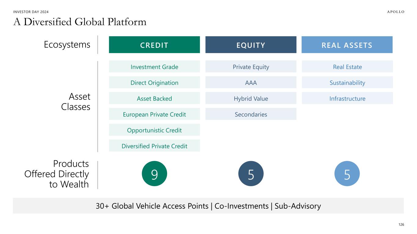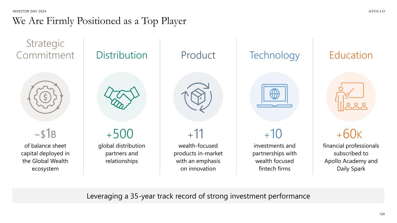INVESTOR DAY 2024 We Are Firmly Positioned as a Top Player 124 Leveraging a 35-year track record of strong investment performance Distribution global distribution partners and relationships Product wealth-focused products in-market with an emphasis on innovation Technology investments and partnerships with wealth focused fintech firms Education financial professionals subscribed to Apollo Academy and Daily Spark Strategic Commitment of balance sheet capital deployed in the Global Wealth ecosystem ~$1B +500 +11 +10 +60K