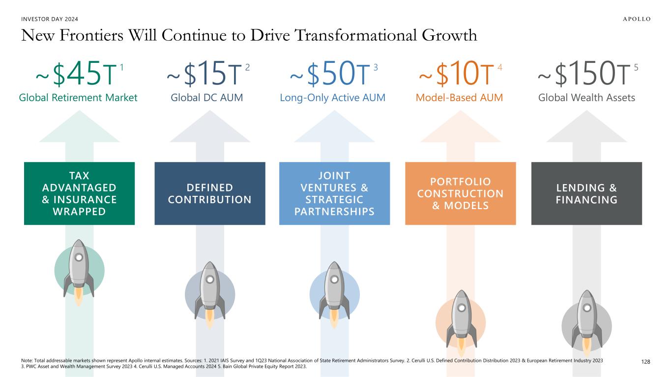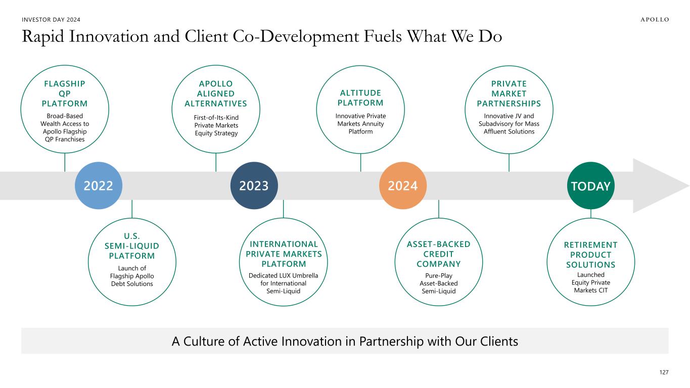 INVESTOR DAY 2024 Dedicated LUX Umbrella for International Semi-Liquid INTERNATIONAL PRIVATE MARKETS PLATFORM Pure-Play Asset-Backed Semi-Liquid ASSET-BACKED CREDIT COMPANY Rapid Innovation and Client Co-Development Fuels What We Do 127 A Culture of Active Innovation in Partnership with Our Clients Broad-Based Wealth Access to Apollo Flagship QP Franchises FLAGSHIP QP PLATFORM First-of-Its-Kind Private Markets Equity Strategy APOLLO ALIGNED ALTERNATIVES Innovative Private Markets Annuity Platform ALTITUDE PLATFORM Innovative JV and Subadvisory for Mass Affluent Solutions PRIVATE MARKET PARTNERSHIPS Launch of Flagship Apollo Debt Solutions U.S. SEMI-LIQUID PLATFORM 2022 TODAY2023 2024 Launched Equity Private Markets CIT RETIREMENT PRODUCT SOLUTIONS