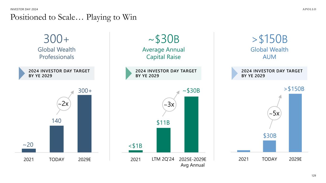 INVESTOR DAY 2024 New Frontiers Will Continue to Drive Transformational Growth 128 ~$45T 1 Global Retirement Market ~$50T 3 Long-Only Active AUM ~$10T 4 Model-Based AUM ~$15T 2 Global DC AUM ~$150T 5 Global Wealth Assets TAX ADVANTAGED & INSURANCE WRAPPED DEFINED CONTRIBUTION JOINT VENTURES & STRATEGIC PARTNERSHIPS PORTFOLIO CONSTRUCTION & MODELS LENDING & FINANCING Note: Total addressable markets shown represent Apollo internal estimates. Sources: 1. 2021 IAIS Survey and 1Q23 National Association of State Retirement Administrators Survey. 2. Cerulli U.S. Defined Contribution Distribution 2023 & European Retirement Industry 2023 3. PWC Asset and Wealth Management Survey 2023 4. Cerulli U.S. Managed Accounts 2024 5. Bain Global Private Equity Report 2023.