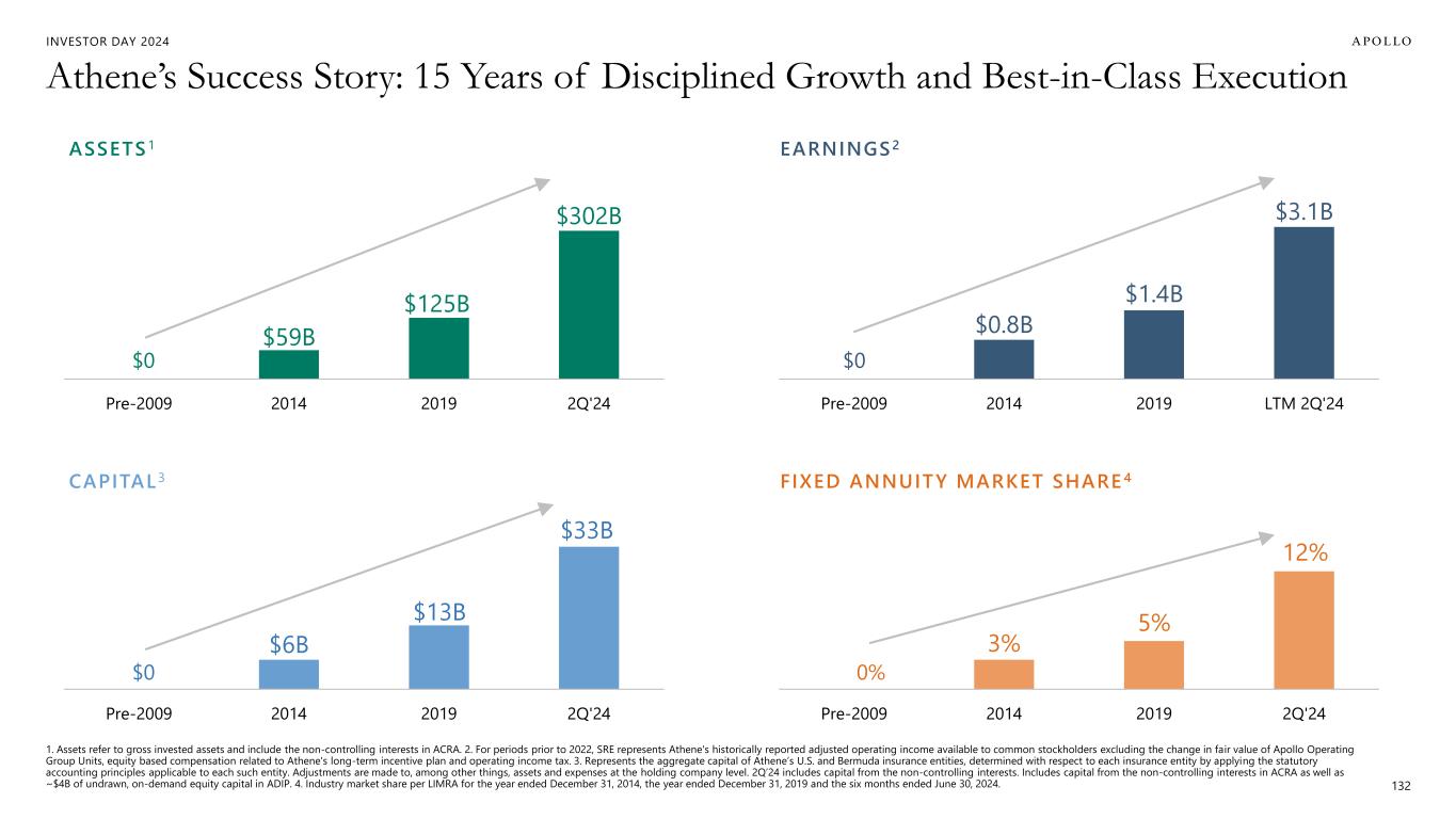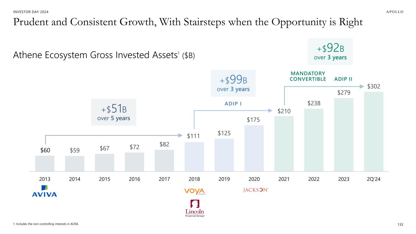 INVESTOR DAY 2024 Athene’s Success Story: 15 Years of Disciplined Growth and Best-in-Class Execution 1. Assets refer to gross invested assets and include the non-controlling interests in ACRA. 2. For periods prior to 2022, SRE represents Athene's historically reported adjusted operating income available to common stockholders excluding the change in fair value of Apollo Operating Group Units, equity based compensation related to Athene's long-term incentive plan and operating income tax. 3. Represents the aggregate capital of Athene’s U.S. and Bermuda insurance entities, determined with respect to each insurance entity by applying the statutory accounting principles applicable to each such entity. Adjustments are made to, among other things, assets and expenses at the holding company level. 2Q’24 includes capital from the non-controlling interests. Includes capital from the non-controlling interests in ACRA as well as ~$4B of undrawn, on-demand equity capital in ADIP. 4. Industry market share per LIMRA for the year ended December 31, 2014, the year ended December 31, 2019 and the six months ended June 30, 2024. 132 3% 5% 12% Pre-2009 2014 2019 2Q'24 $6B $13B $33B Pre-2009 2014 2019 2Q'24 ASSETS 1 EARNINGS 2 CAPITAL 3 FIXED ANNUITY MARKET SHARE 4 $59B $125B $302B Pre-2009 2014 2019 2Q'24 $0.8B $1.4B $3.1B Pre-2009 2014 2019 LTM 2Q'24 0%$0 $0 $0