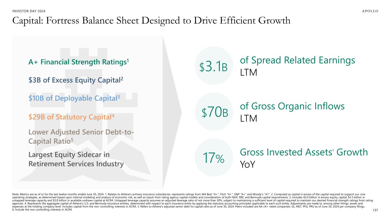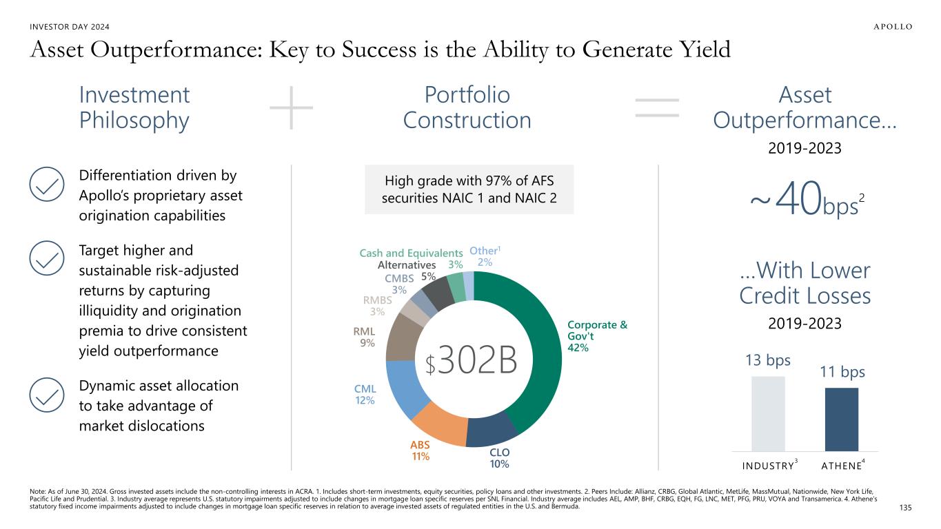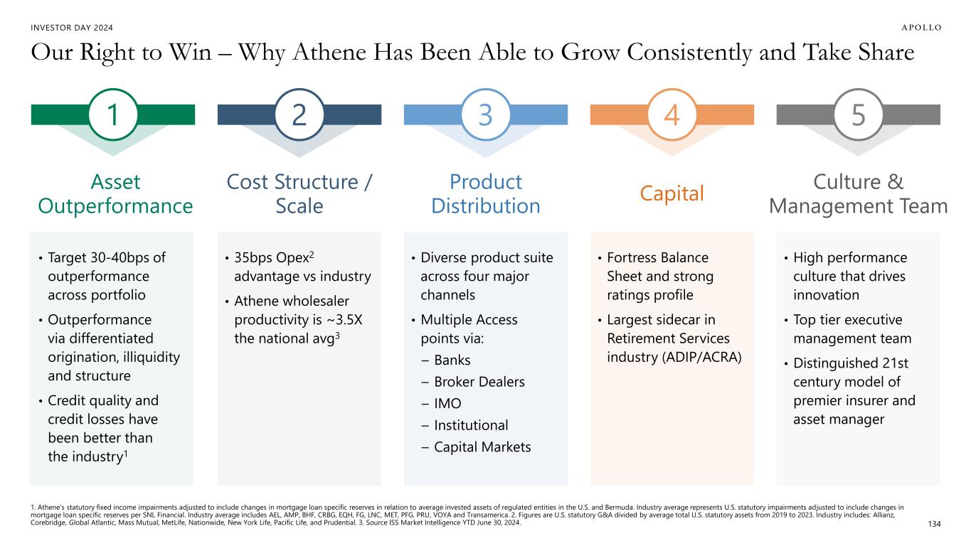 INVESTOR DAY 2024 Our Right to Win – Why Athene Has Been Able to Grow Consistently and Take Share 1. Athene’s statutory fixed income impairments adjusted to include changes in mortgage loan specific reserves in relation to average invested assets of regulated entities in the U.S. and Bermuda. Industry average represents U.S. statutory impairments adjusted to include changes in mortgage loan specific reserves per SNL Financial. Industry average includes AEL, AMP, BHF, CRBG, EQH, FG, LNC, MET, PFG, PRU, VOYA and Transamerica. 2. Figures are U.S. statutory G&A divided by average total U.S. statutory assets from 2019 to 2023. Industry includes: Allianz, Corebridge, Global Atlantic, Mass Mutual, MetLife, Nationwide, New York Life, Pacific Life, and Prudential. 3. Source ISS Market Intelligence YTD June 30, 2024. 134 1 2 3 Asset Outperformance Cost Structure / Scale Product Distribution 4 Capital 5 Culture & Management Team • Diverse product suite across four major channels • Multiple Access points via: – Banks – Broker Dealers – IMO – Institutional – Capital Markets • Target 30-40bps of outperformance across portfolio • Outperformance via differentiated origination, illiquidity and structure • Credit quality and credit losses have been better than the industry1 • 35bps Opex2 advantage vs industry • Athene wholesaler productivity is ~3.5X the national avg3 • Fortress Balance Sheet and strong ratings profile • Largest sidecar in Retirement Services industry (ADIP/ACRA) • High performance culture that drives innovation • Top tier executive management team • Distinguished 21st century model of premier insurer and asset manager