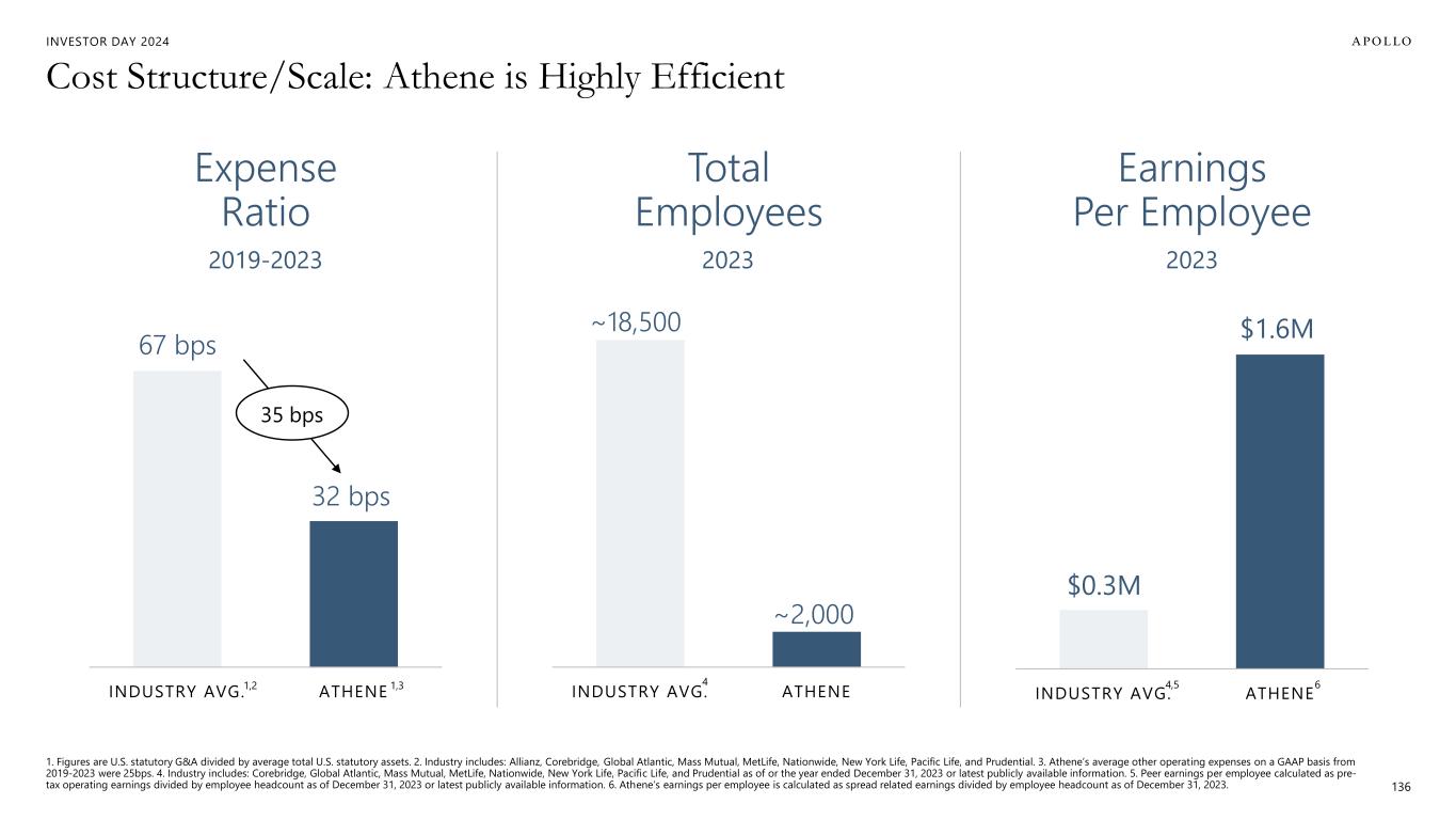 INVESTOR DAY 2024 ~18,500 ~2,000 INDUSTRY AVG. ATHENE 4,5 6 Cost Structure/Scale: Athene is Highly Efficient 1. Figures are U.S. statutory G&A divided by average total U.S. statutory assets. 2. Industry includes: Allianz, Corebridge, Global Atlantic, Mass Mutual, MetLife, Nationwide, New York Life, Pacific Life, and Prudential. 3. Athene’s average other operating expenses on a GAAP basis from 2019-2023 were 25bps. 4. Industry includes: Corebridge, Global Atlantic, Mass Mutual, MetLife, Nationwide, New York Life, Pacific Life, and Prudential as of or the year ended December 31, 2023 or latest publicly available information. 5. Peer earnings per employee calculated as pre- tax operating earnings divided by employee headcount as of December 31, 2023 or latest publicly available information. 6. Athene’s earnings per employee is calculated as spread related earnings divided by employee headcount as of December 31, 2023. 136 Total Employees Expense Ratio $0.3M $1.6M INDUSTRY AVG. ATHENE 4 67 bps 32 bps INDUSTRY AVG. ATHENE 1,2 1,3 Earnings Per Employee 2019-2023 20232023 35 bps