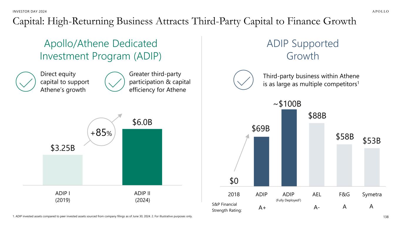 INVESTOR DAY 2024 Capital: Fortress Balance Sheet Designed to Drive Efficient Growth Note: Metrics are as of or for the last twelve months ended June 30, 2024. 1. Relates to Athene’s primary insurance subsidiaries; represents ratings from AM Best "A+", Fitch "A+", S&P "A+" and Moody’s "A1". 2. Computed as capital in excess of the capital required to support our core operating strategies, as determined based upon internal modeling and analysis of economic risk, as well as inputs from rating agency capital models and consideration of both NAIC RBC and Bermuda capital requirements. 3. Includes $3.0 billion in excess equity capital, $3.3 billion in untapped leverage capacity and $3.8 billion in available undrawn capital at ACRA. Untapped leverage capacity assumes an adjusted leverage ratio of not more than 30%, subject to maintaining a sufficient level of capital required to maintain our desired financial strength ratings from rating agencies. 4. Represents the aggregate capital of Athene’s U.S. and Bermuda insurance entities, determined with respect to each insurance entity by applying the statutory accounting principles applicable to each such entity. Adjustments are made to, among other things, assets and expenses at the holding company level. Includes capital from the non-controlling interests in ACRA. 5. Refers to Athene’s adjusted senior debt-to-capital ratio as of June 30, 2024. Peers included are AA-/A+ rated companies: GL, MET, PFG, PRU as of June 30, 2024 per company filings. 6. Include the non-controlling interests in ACRA 137 A+ Financial Strength Ratings1 $3B of Excess Equity Capital2 $10B of Deployable Capital3 $29B of Statutory Capital4 Lower Adjusted Senior Debt-to- Capital Ratio5 Largest Equity Sidecar in Retirement Services Industry $3.1B of Spread Related Earnings LTM $70B of Gross Organic Inflows LTM 17% Gross Invested Assets6 Growth YoY