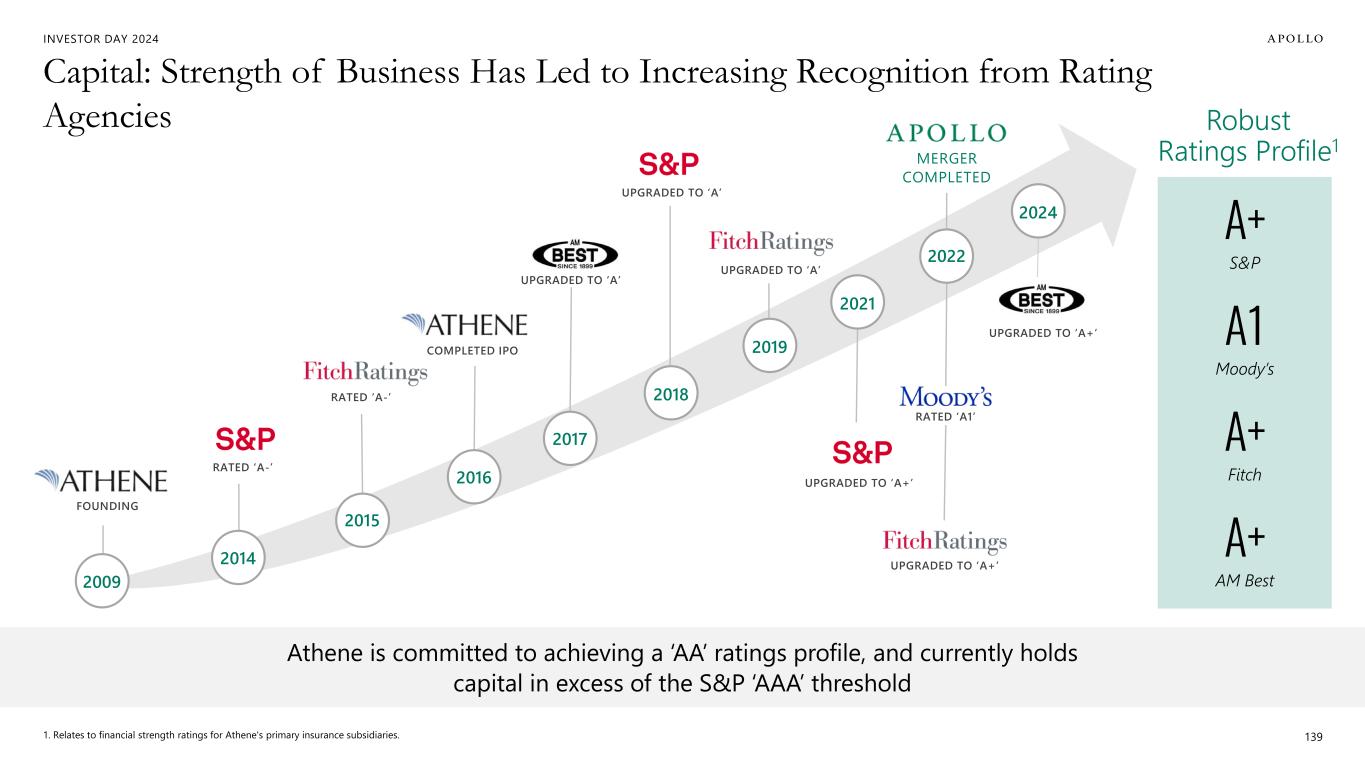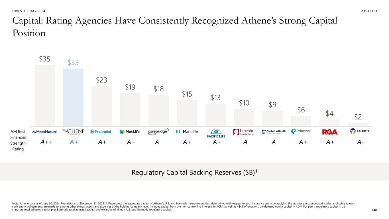 INVESTOR DAY 2024 $35 $33 $23 $19 $18 $15 $13 $10 $9 $6 $4 $2 Mass Mutual Athene PRU MetLife Corebridge Manulife Pacific Life Lincoln Global Atlantic Principal RGA Talcott Capital: Rating Agencies Have Consistently Recognized Athene’s Strong Capital Position 140 AM Best Financial Strength Rating A++ A+ A+ A+ A A+ A+ A A+ A+ Regulatory Capital Backing Reserves ($B)1 A A- Note: Athene data as of June 30, 2024. Peer data as of December 31, 2023. 1. Represents the aggregate capital of Athene’s U.S. and Bermuda insurance entities, determined with respect to each insurance entity by applying the statutory accounting principles applicable to each such entity. Adjustments are made to, among other things, assets and expenses at the holding company level. Includes capital from the non-controlling interests in ACRA as well as ~$4B of undrawn, on-demand equity capital in ADIP. For peers, regulatory capital is U.S. statutory total adjusted capital plus Bermuda total adjusted capital and exclusive of all non-U.S. and Bermuda regulatory capital.