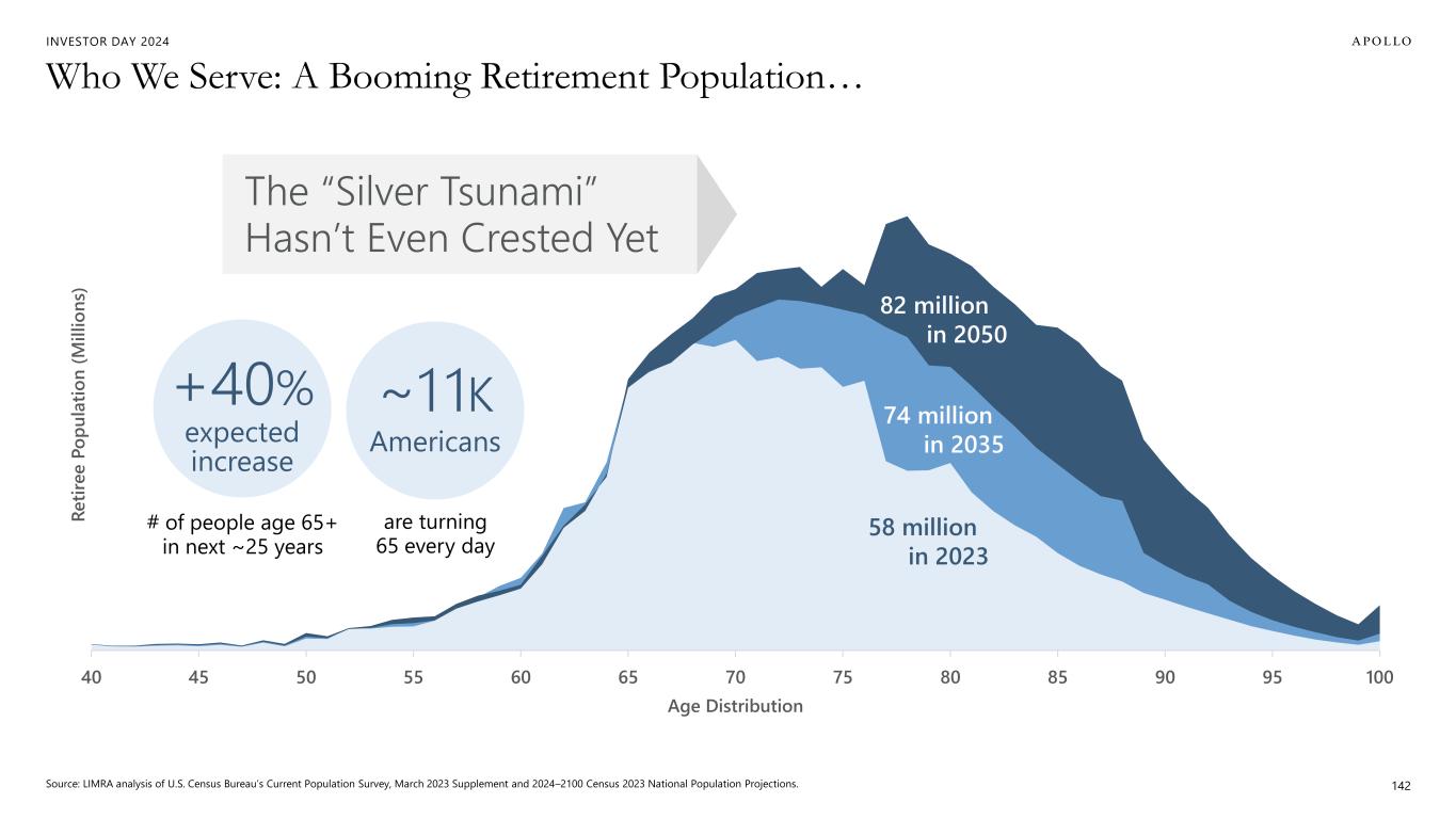 INVESTOR DAY 2024 40 45 50 55 60 65 70 75 80 85 90 95 100 R e ti re e P o p u la ti o n ( M il li o n s) Age Distribution 74 million in 2035 82 million in 2050 58 million in 2023 Who We Serve: A Booming Retirement Population… Source: LIMRA analysis of U.S. Census Bureau’s Current Population Survey, March 2023 Supplement and 2024–2100 Census 2023 National Population Projections. 142 # of people age 65+ in next ~25 years +40% expected increase The “Silver Tsunami” Hasn’t Even Crested Yet are turning 65 every day ~1 1K Americans