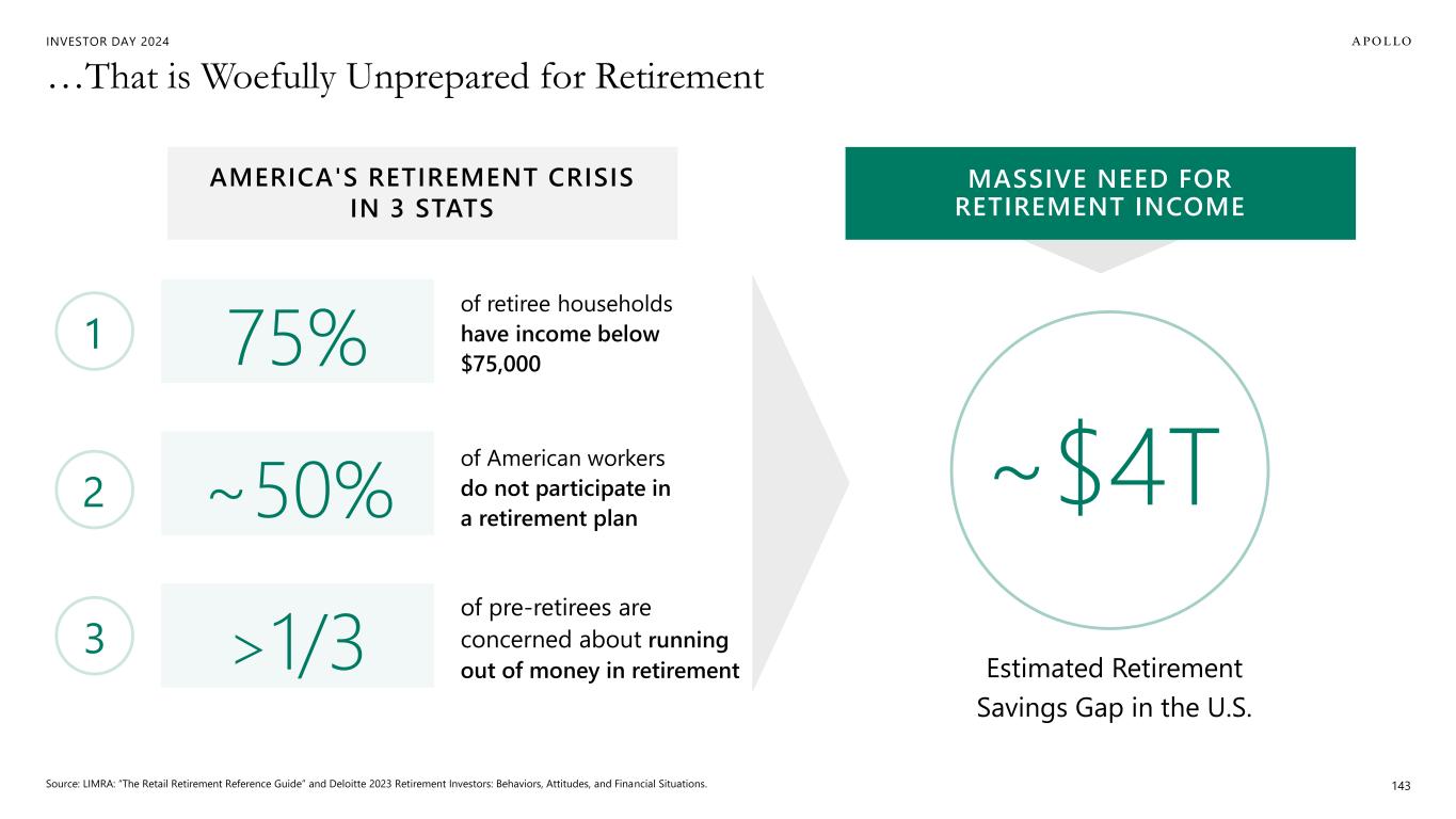 INVESTOR DAY 2024 …That is Woefully Unprepared for Retirement Source: LIMRA: “The Retail Retirement Reference Guide” and Deloitte 2023 Retirement Investors: Behaviors, Attitudes, and Financial Situations. 143 MASSIVE NEED FOR RETIREMENT INCOME AMERICA'S RETIREMENT CRISIS IN 3 STATS of retiree households have income below $75,00075% of American workers do not participate in a retirement plan~50% of pre-retirees are concerned about running out of money in retirement>1/3 1 2 3 ~$4T Estimated Retirement Savings Gap in the U.S.