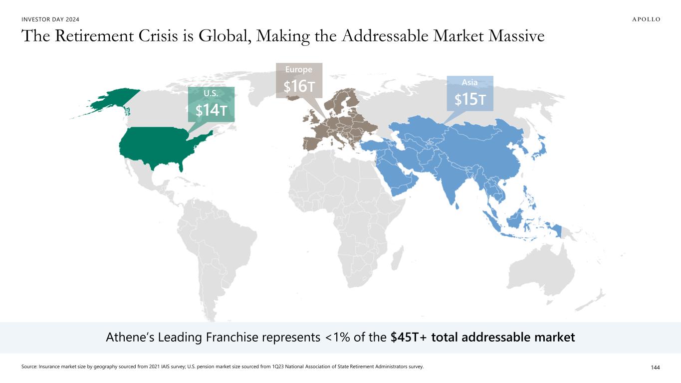 INVESTOR DAY 2024 The Retirement Crisis is Global, Making the Addressable Market Massive Source: Insurance market size by geography sourced from 2021 IAIS survey; U.S. pension market size sourced from 1Q23 National Association of State Retirement Administrators survey. 144 Athene’s Leading Franchise represents <1% of the $45T+ total addressable market $14T U.S. $16T Europe $15T Asia