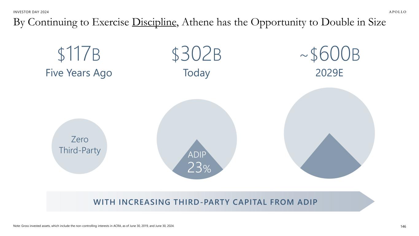 INVESTOR DAY 2024 Today By Continuing to Exercise Discipline, Athene has the Opportunity to Double in Size Note: Gross invested assets, which include the non-controlling interests in ACRA, as of June 30, 2019, and June 30, 2024. 146 Five Years Ago 2029E WITH INCREASING THIRD-PARTY CAPITAL FROM ADIP $117B $302B ~$600B 23% ADIP Zero Third-Party