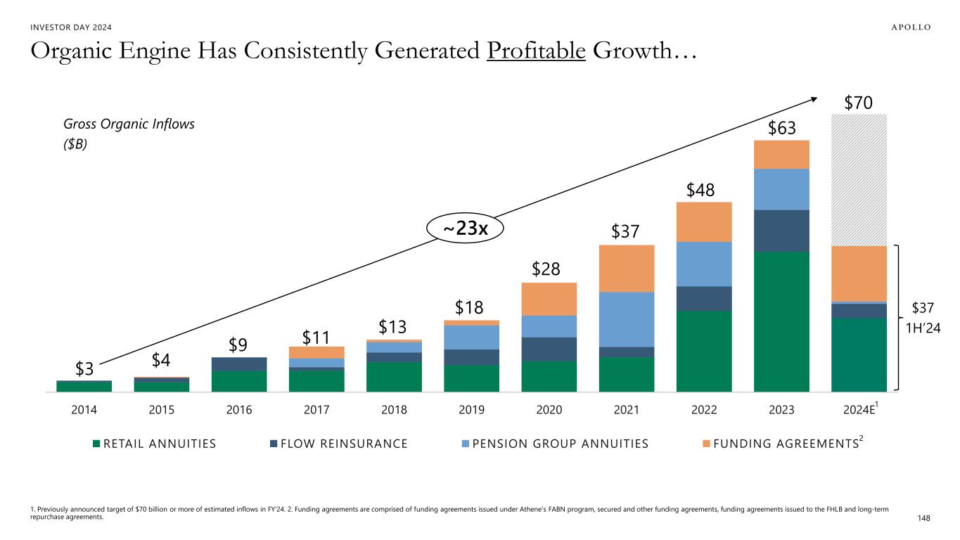 INVESTOR DAY 2024 2014 2015 2016 2017 2018 2019 2020 2021 2022 2023 2024E RETAIL ANNUITIES FLOW REINSURANCE PENSION GROUP ANNUITIES FUNDING AGREEMENTS $3 $4 $9 $11 $13 $18 $28 $37 $48 $63 $70 $37 1H’24 Organic Engine Has Consistently Generated Profitable Growth… 1. Previously announced target of $70 billion or more of estimated inflows in FY'24. 2. Funding agreements are comprised of funding agreements issued under Athene's FABN program, secured and other funding agreements, funding agreements issued to the FHLB and long-term repurchase agreements. 148 ~23x Gross Organic Inflows ($B) 2 1