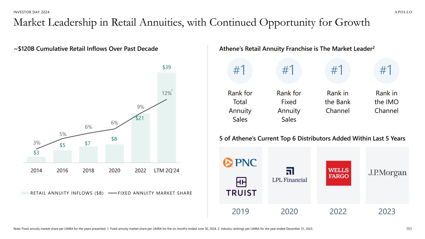 INVESTOR DAY 2024 Market Leadership in Retail Annuities, with Continued Opportunity for Growth Note: Fixed annuity market share per LIMRA for the years presented. 1. Fixed annuity market share per LIMRA for the six months ended June 30, 2024. 2. Industry rankings per LIMRA for the year ended December 31, 2023. $3 $5 $7 $8 $21 $39 3% 5% 6% 6% 9% 12% 0% 2% 4% 6% 8% 10% 12% 14% 16% 18% 20% $0 $5 $10 $15 $20 $25 $30 $35 $40 $45 2014 2016 2018 2020 2022 LTM 2Q'24 RETAIL ANNUITY INFLOWS ($B) FIXED ANNUITY MARKET SHARE ~$120B Cumulative Retail Inflows Over Past Decade 5 of Athene’s Current Top 6 Distributors Added Within Last 5 Years Rank for Total Annuity Sales Rank for Fixed Annuity Sales Rank in the Bank Channel Rank in the IMO Channel Athene’s Retail Annuity Franchise is The Market Leader2 #1 #1 #1 #1 2023202220202019 151 1