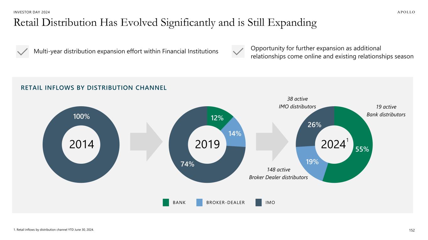 INVESTOR DAY 2024 Retail Distribution Has Evolved Significantly and is Still Expanding 1. Retail inflows by distribution channel YTD June 30, 2024. 152 55% 19% 26% 12% 14% 74% 100% RETAIL INFLOWS BY DISTRIBUTION CHANNEL 2019 2024 1 2014 BANK IMOBROKER-DEALER Multi-year distribution expansion effort within Financial Institutions Opportunity for further expansion as additional relationships come online and existing relationships season 19 active Bank distributors 148 active Broker Dealer distributors 38 active IMO distributors