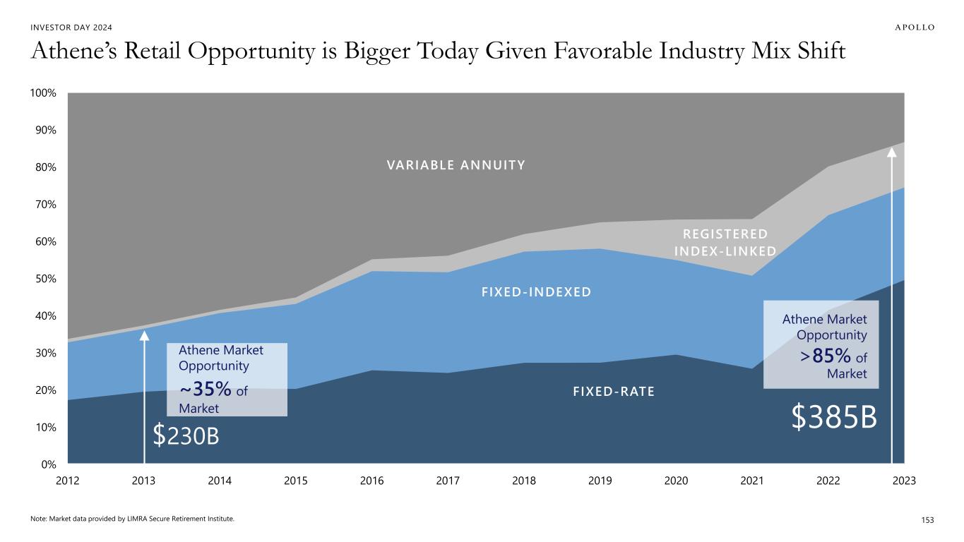 INVESTOR DAY 2024 Athene’s Retail Opportunity is Bigger Today Given Favorable Industry Mix Shift 153 0% 10% 20% 30% 40% 50% 60% 70% 80% 90% 100% 2012 2013 2014 2015 2016 2017 2018 2019 2020 2021 2022 2023 VARIABLE ANNUITY REGISTERED INDEX-LINKED FIXED-INDEXED FIXED-RATE Athene Market Opportunity ~35% of Market $230B Athene Market Opportunity >85% of Market $385B Note: Market data provided by LIMRA Secure Retirement Institute.
