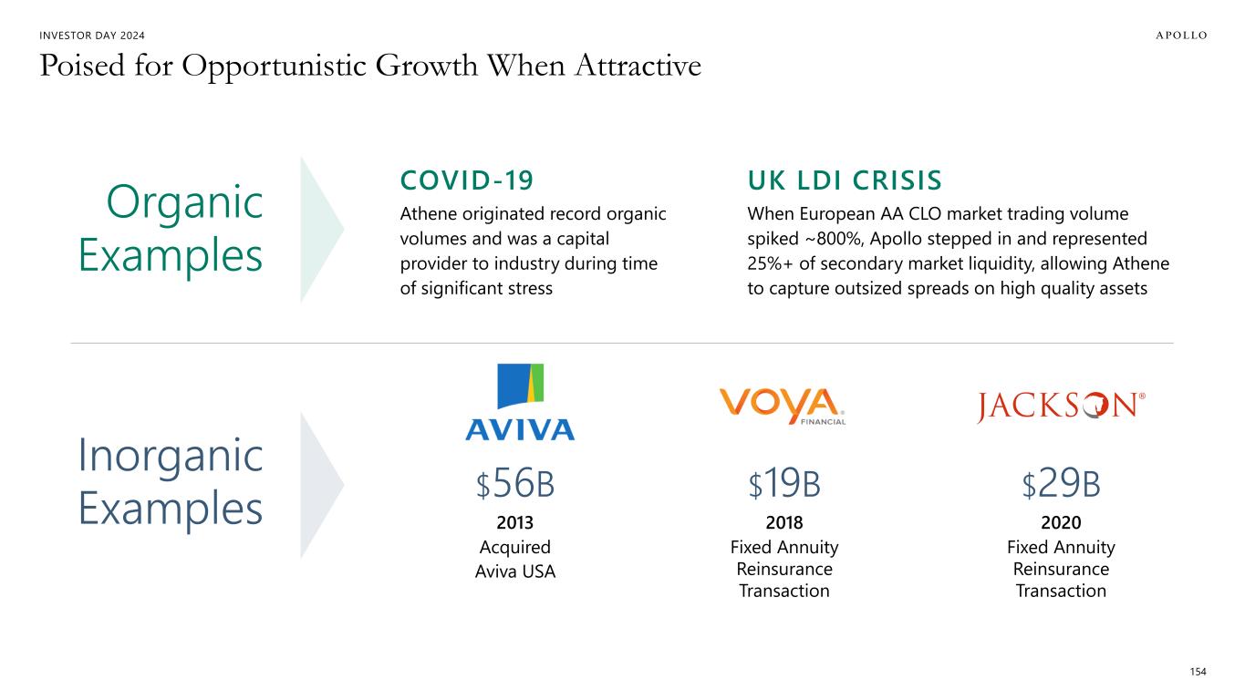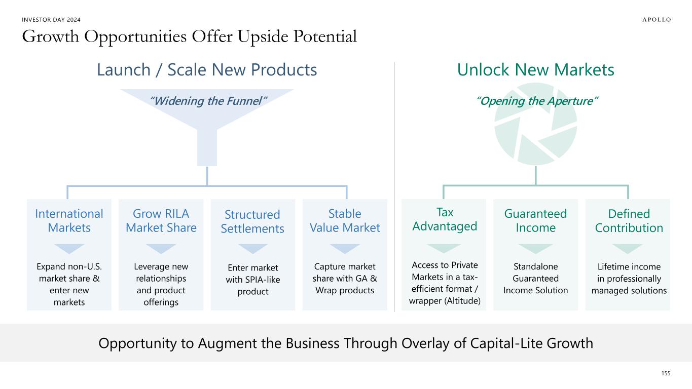 INVESTOR DAY 2024 Poised for Opportunistic Growth When Attractive 154 Organic Examples Inorganic Examples COVID-19 Athene originated record organic volumes and was a capital provider to industry during time of significant stress UK LDI CRISIS When European AA CLO market trading volume spiked ~800%, Apollo stepped in and represented 25%+ of secondary market liquidity, allowing Athene to capture outsized spreads on high quality assets $19B 2018 Fixed Annuity Reinsurance Transaction $29B 2020 Fixed Annuity Reinsurance Transaction $56B 2013 Acquired Aviva USA
